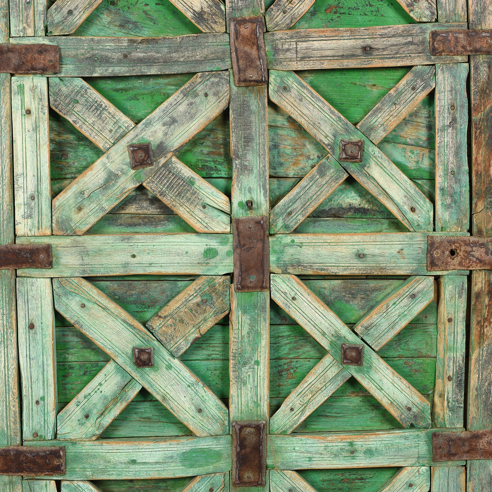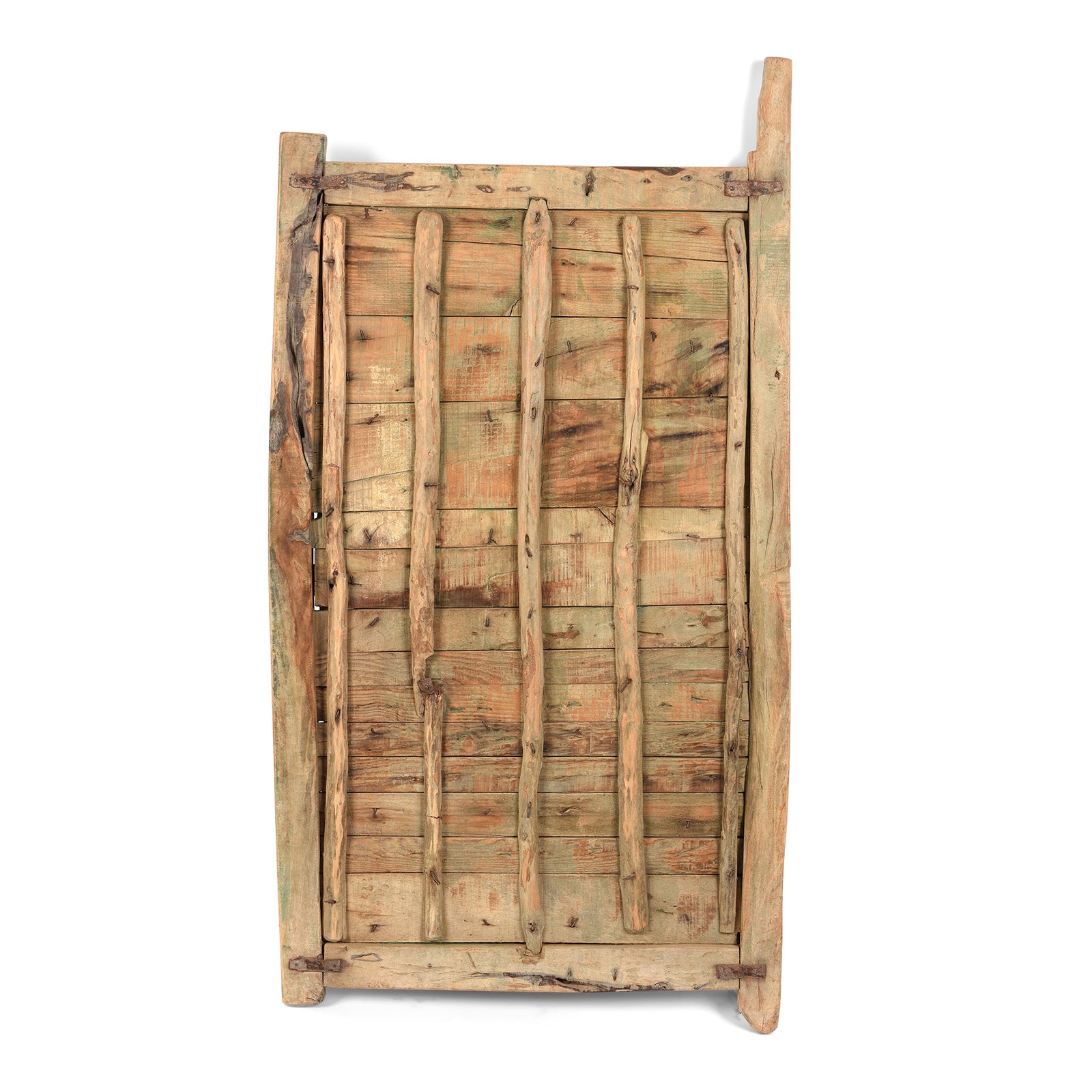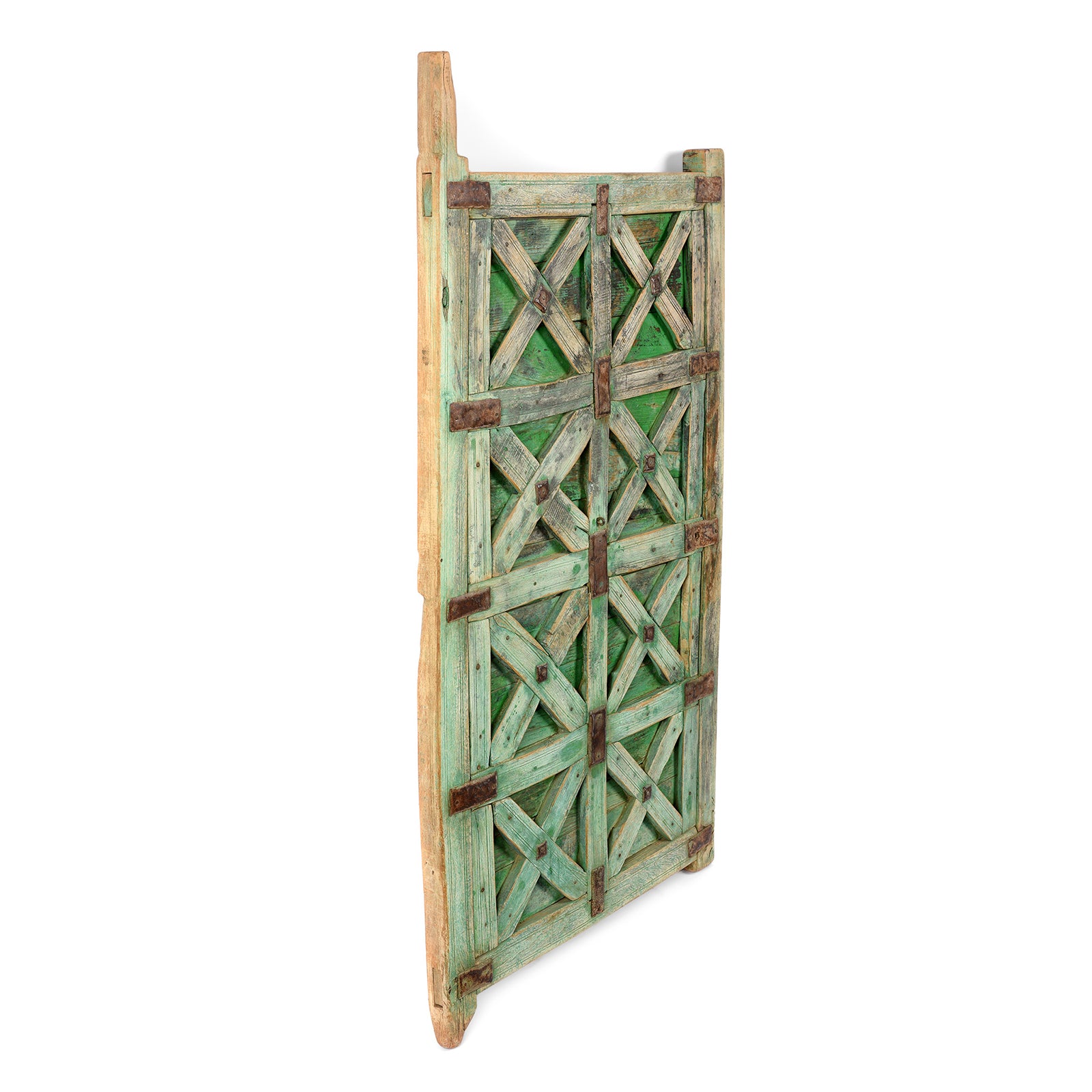 This green painted stick door dates to ninteenth century India. They were used by the desert-dwelling tribes of Western Rajasthan near the city of Jaisalmer in their buildings which were made of mud and clay. See the final photograph for how these doors were used.