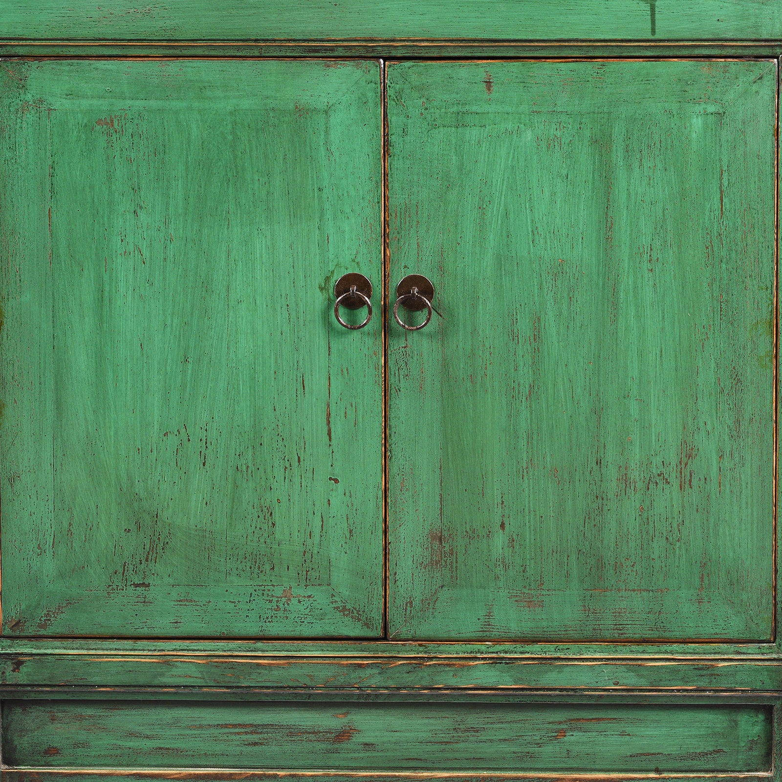 This green lacquered sideboard is not antique but it is made from reclaimed wood from old doors. It is made in the classic Mongolian style. With four doors, this sideboard is great for storage in a kitchen, living room, or hallway.