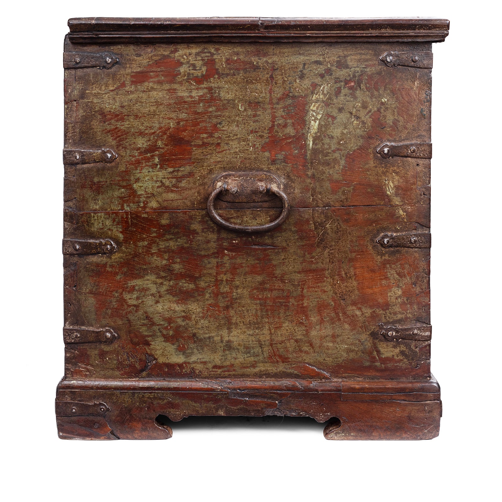 This 19th-century iron-bound teak chest from Gujarat was most likely custom-made for a wealthy household to store dowry, valuables, or family treasures. Its solid teak construction is reinforced with heavy iron fittings, while layers of old painted finishes in muted reds, greens, and browns create a naturally distressed surface with rich depth and character.