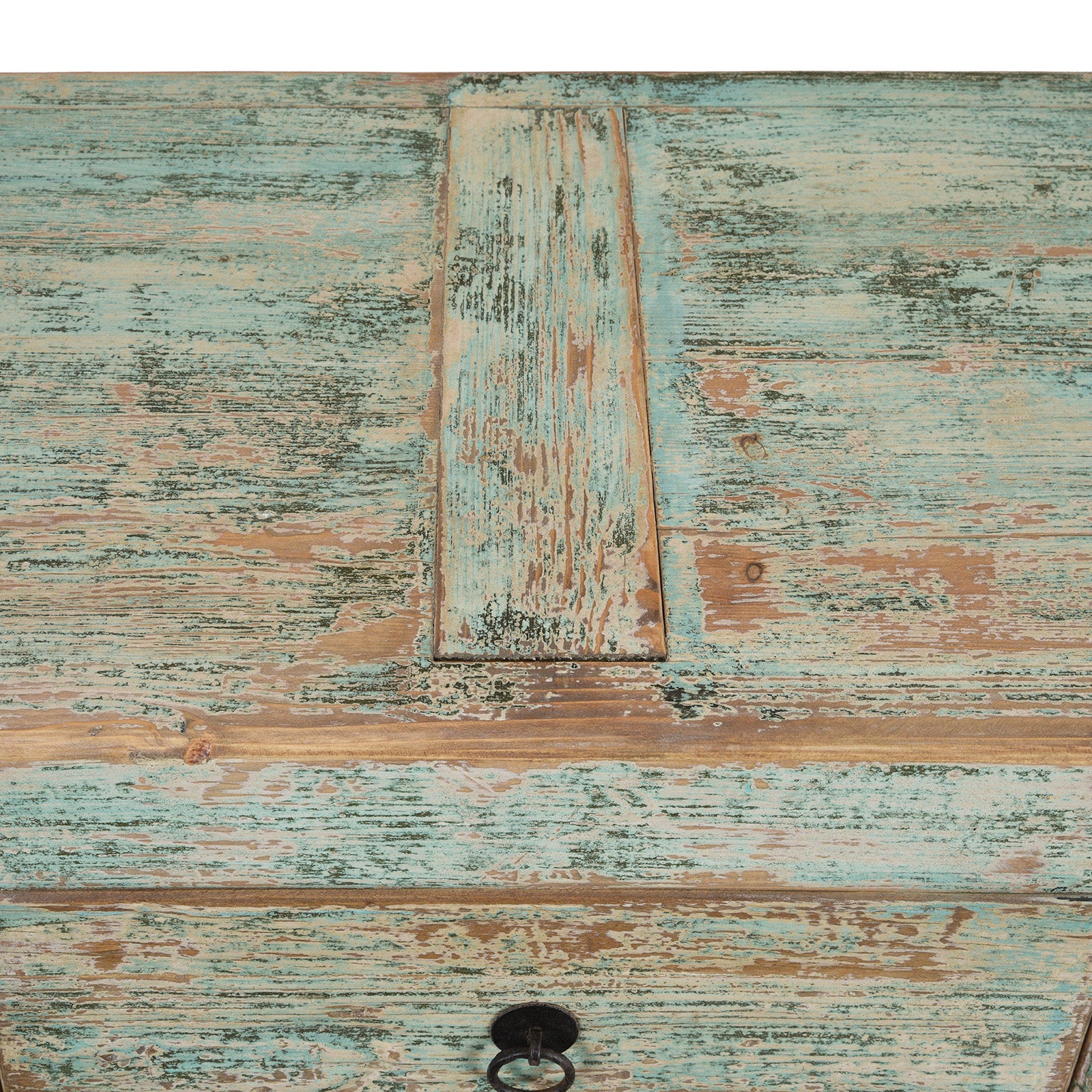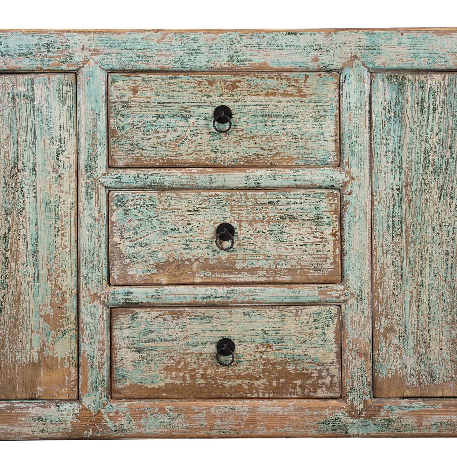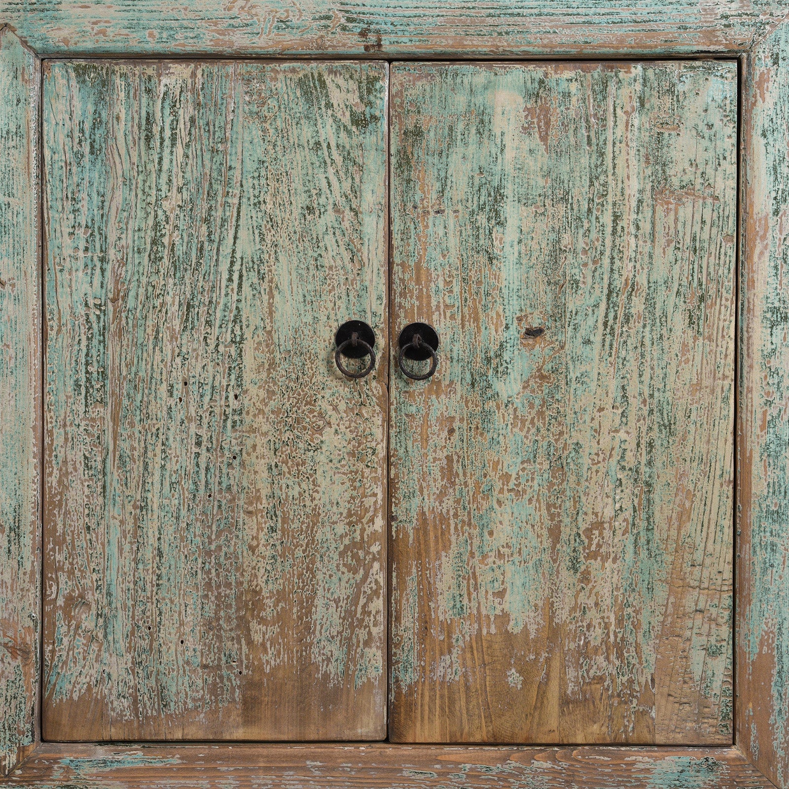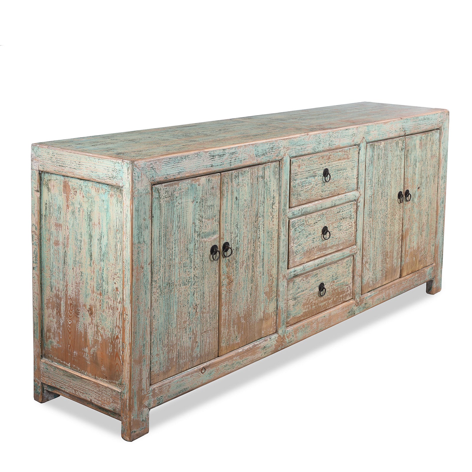 This rustic Chinese sideboard is made from reclaimed wood. It is constructed in the traditional way using old sun-bleached elm, poplar, and pine woods and finished in distressed green paint.