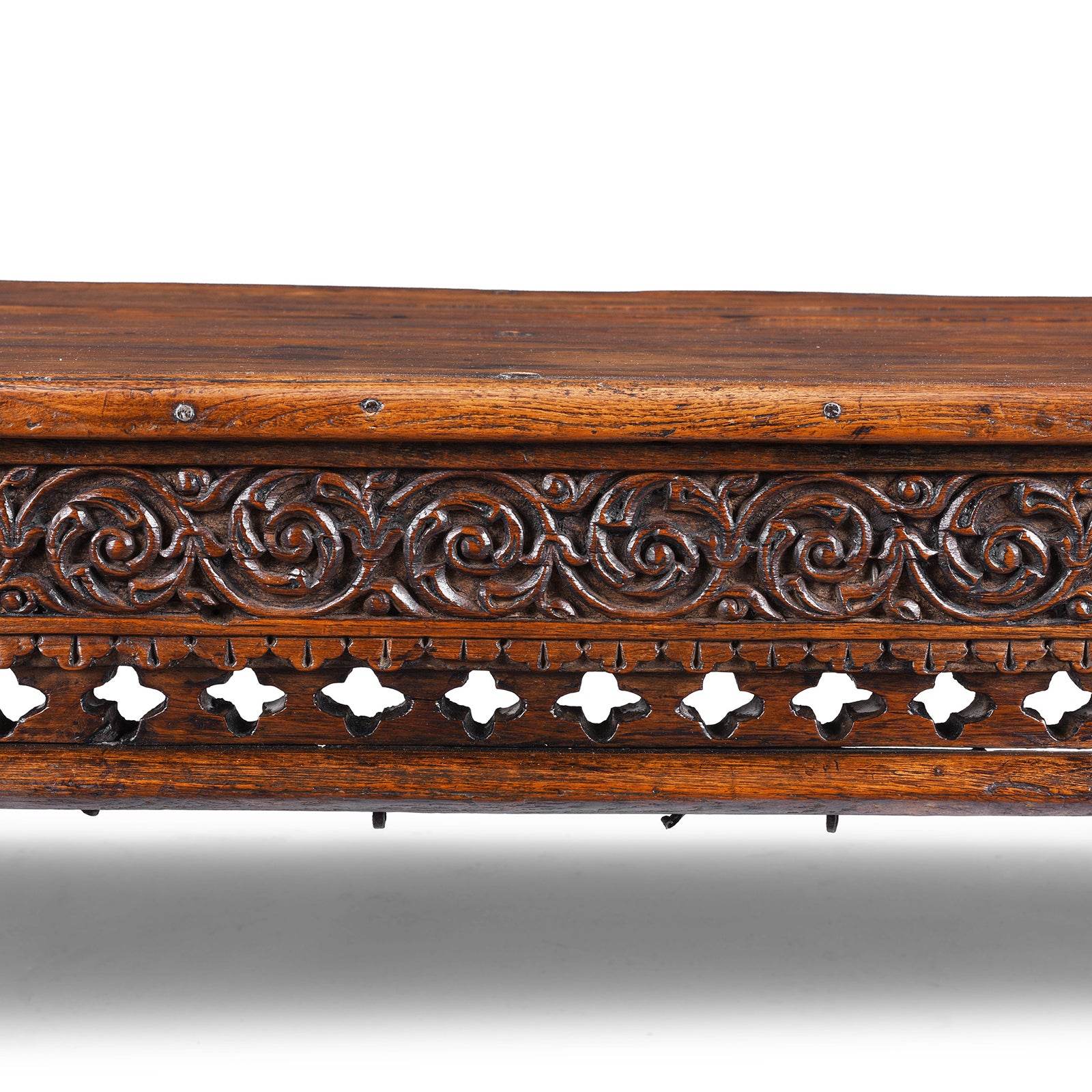 Surface Detail From Antique Nineteenth Century Gujarati Roheda Wood Takhat Coffee Table With Carved Apron And Turned Lacquered Legs