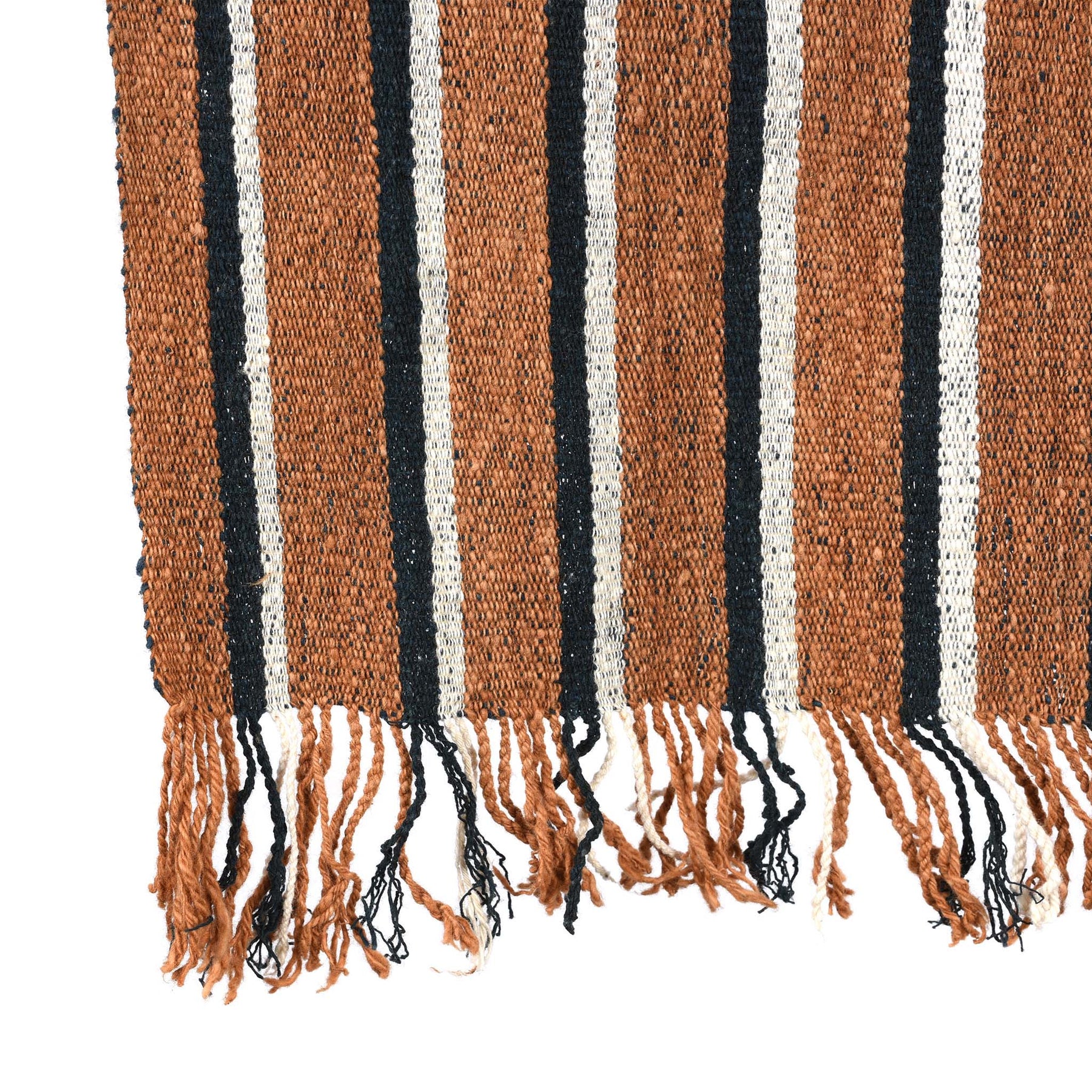 The plain weave textile is handwoven in the traditional way on a loom from locally grown hand-spun cotton. It's a single panel with a twisted fringe and can be used as a runner or worn as a shawl or scarf. It is initially rough to the skin but softens beautifully after a couple of wears.