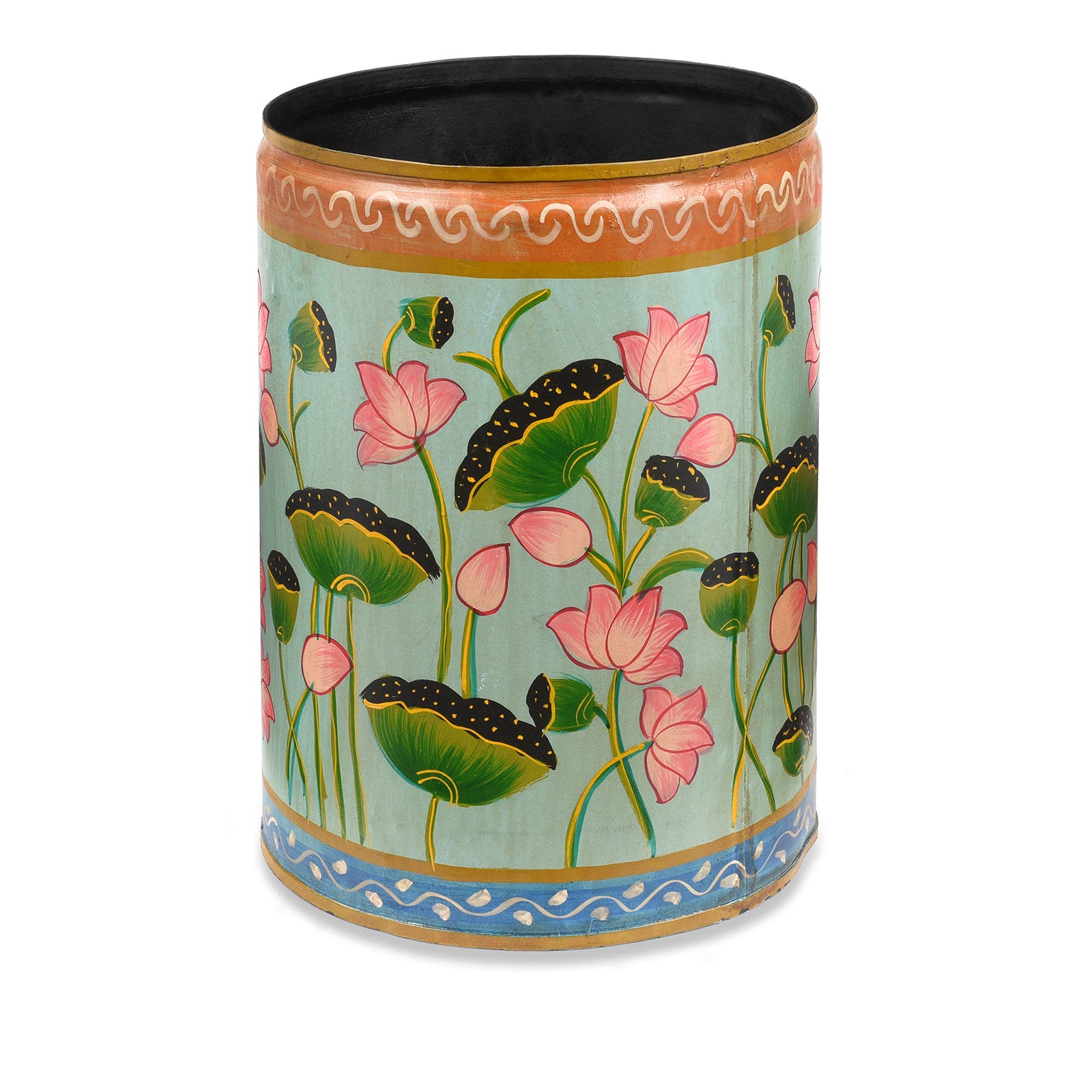 Inspired by traditional pichwai painting, these old iron drums have been recycled and repainted in the typical Rajasthani style with floral patterns. It's useful and pretty and it keeps your home and your office clean and tidy.