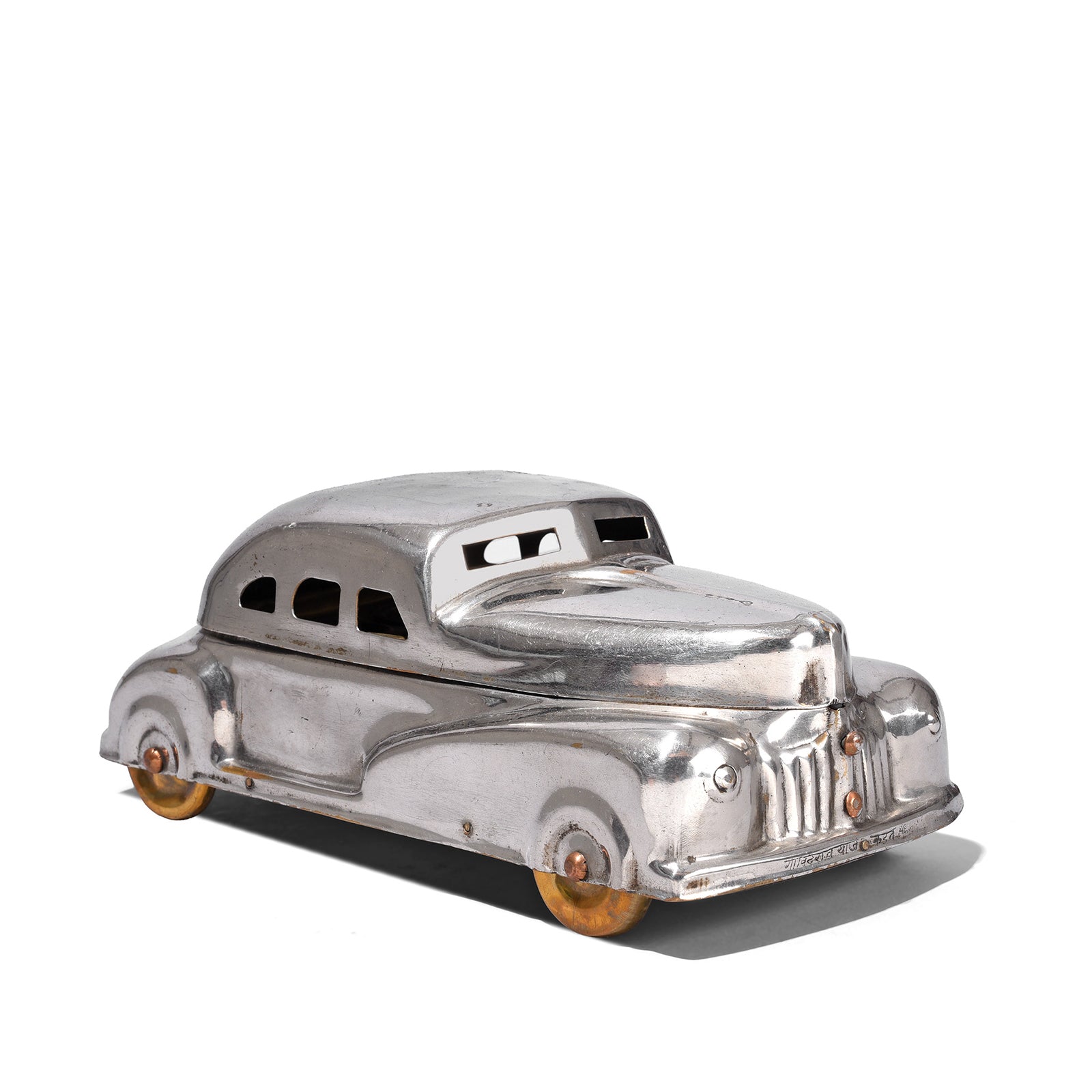 The design follows the lines of the Chevrolet Special DeLuxe Sedan, produced between 1941 and 1948, complete with stylised detailing and rolling brass wheels. On the underside of the boot is stamped: "Betel Motor Car, Open & Close Type - Patent No 75086." This intriguing reference to a patent number, which does not appear in historical records, adds to the curious and whimsical nature of the piece.