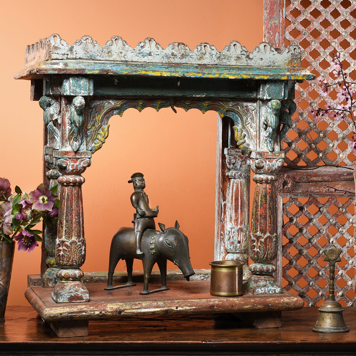 This bronze Bhuta figure is from Karnataka and features Panjurli riding a wild boar. It is rare, a great collectors piece, and incredibly special dating to the 18th century. Panjurli is the divine spirit of a male wild boar worshipped as a part of Bhuta Kola. Panjurli is usually seen with a boar head, but here, he has a human head with a stylised tusk shaped moustache. Panjurli is often seen with a bell in one hand and a sword in the other. The bell remains and the blade was originally movable but has long since been lost. Panjurli & his mount are cast separately and secured by a lug on his back. Both are finely cast with excellent proportions and covered in a rich patina. There are some firing faults which can be seen in photos in the tail area.