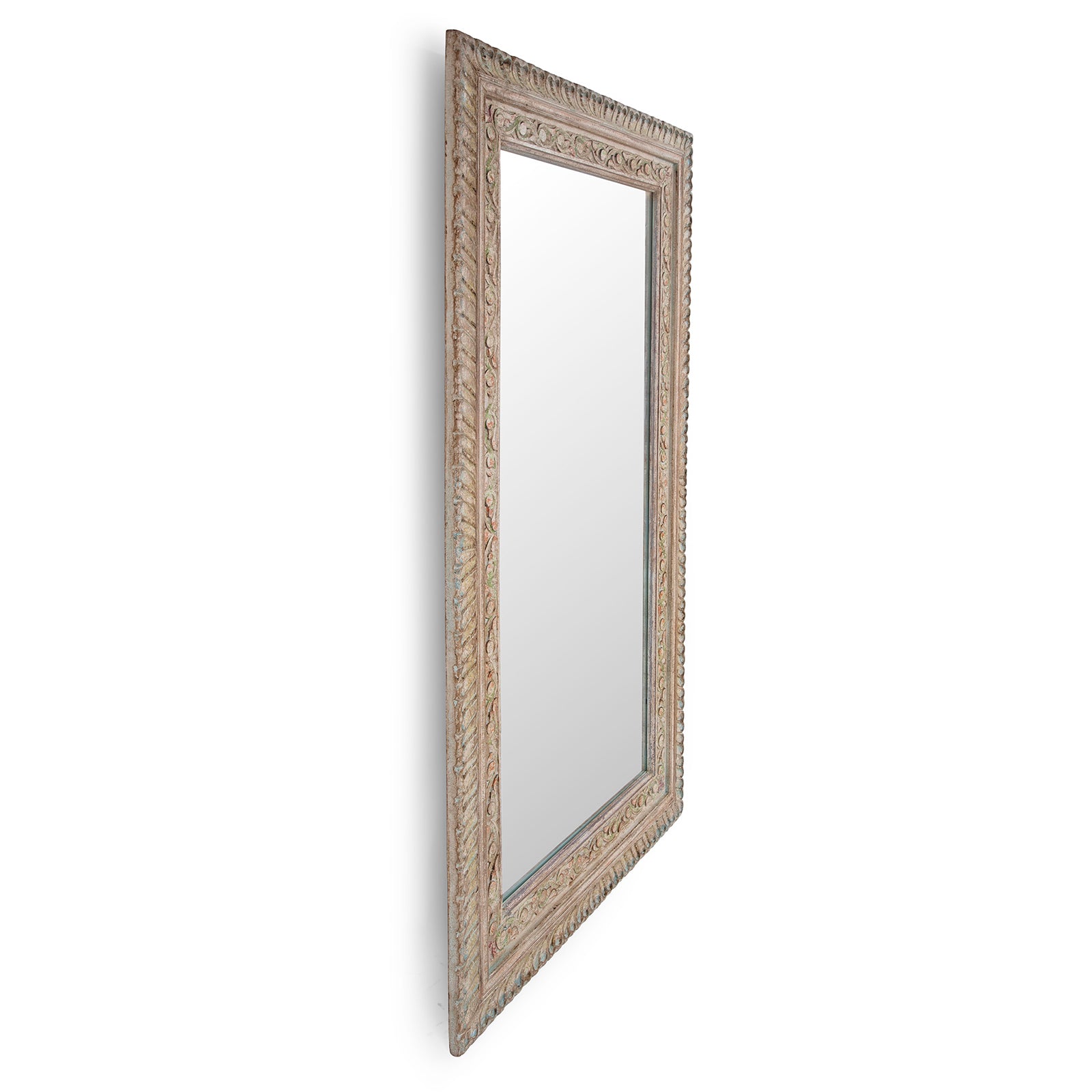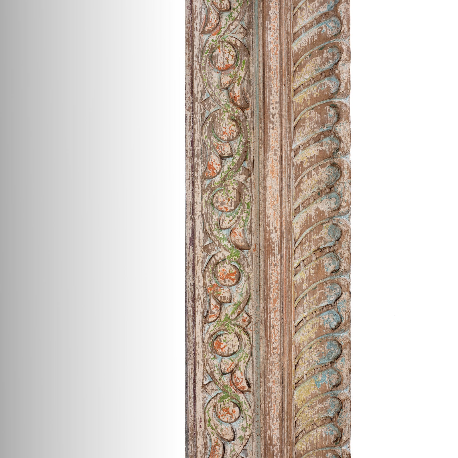 This elegant Indian mirror is hand carved from sustainable mango wood and finished with traces of soft polychrome colouring in muted reds, greens, and blues. The detailed floral and foliate carving along the frame highlights the craftsmanship and gives the piece a timeless character.