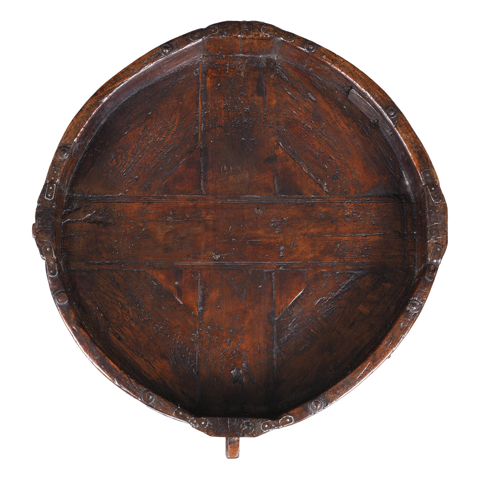 This striking 19th century Indian chakki table is a superb example of traditional village craftsmanship, repurposed today as a versatile and highly decorative piece of furniture. Hand-carved from solid teak, it was originally used as a rice or grain grinding mill in rural Rajasthan or Gujarat. The circular form features bold chip-carved decoration around the edge, showcasing geometric and floral motifs that highlight the artisan's skill.
