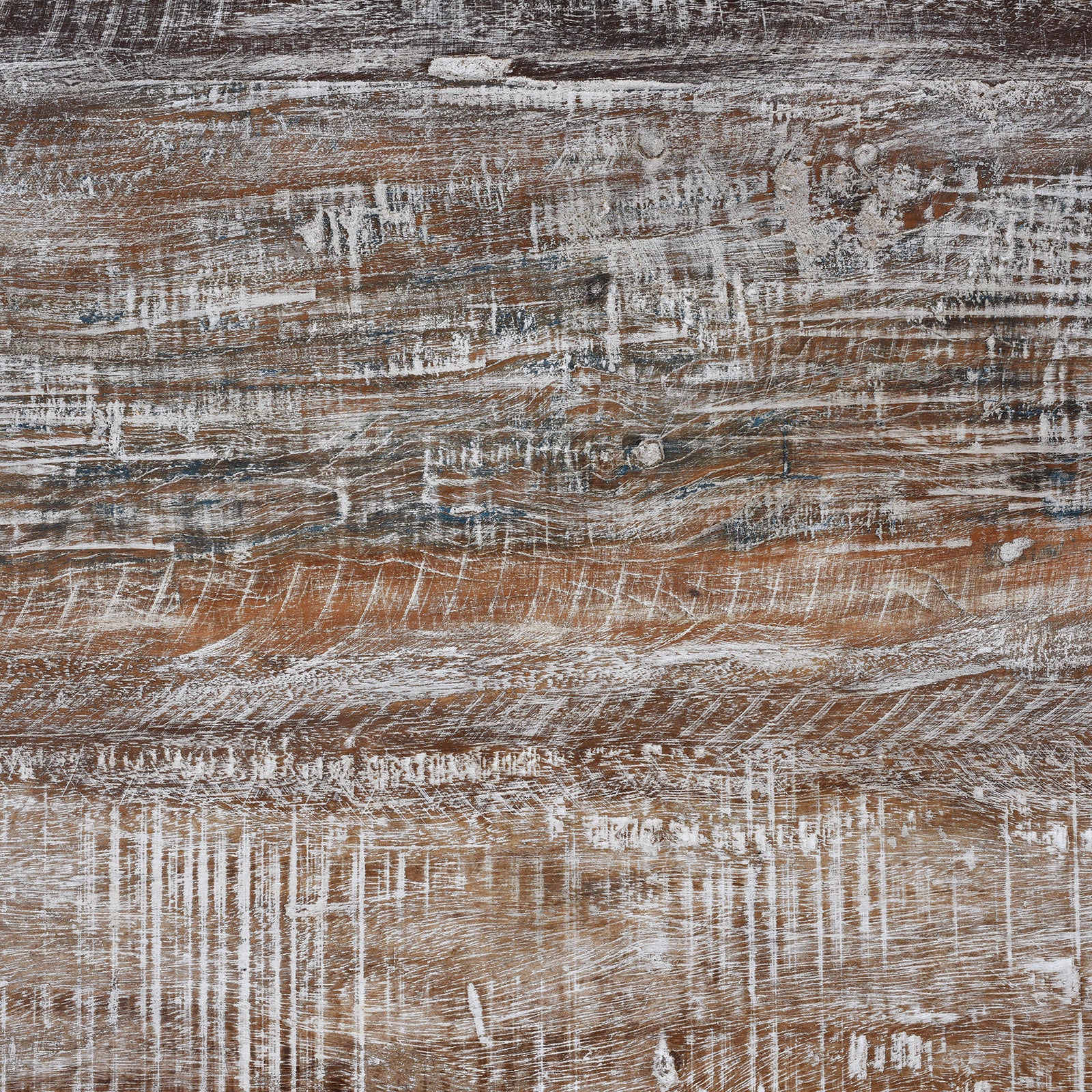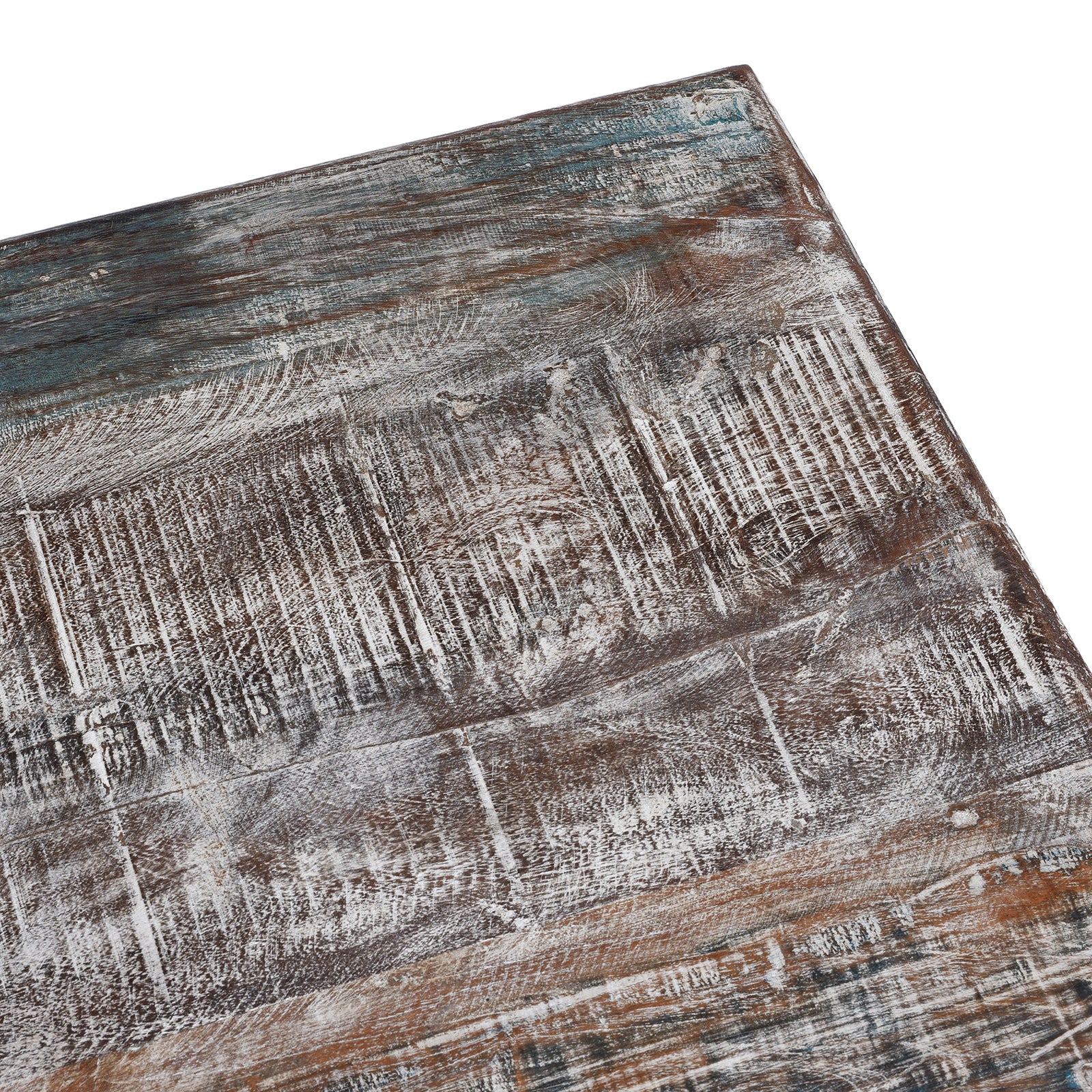 The antique teak used in its construction features detailed carved elements originally created in the 19th century, now thoughtfully reassembled into a new and highly functional form. The carved apron runs continuously around the table, displaying repeating foliate motifs, while the turned legs and solid plank top give the piece strength and balance. Finished with a softly distressed surface, this table is designed to sit comfortably within a wide range of modern interiors, offering a subtle sense of age without overpowering a space.