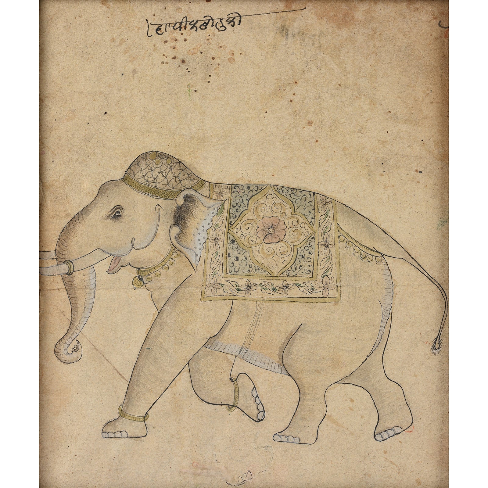 This charming framed Indian drawing is in the Rajasthani style and depicts an elephant facing left. The drawing is in ink with shading. Arabic script is visible at the top of the page and there are some visible historic fold marks.