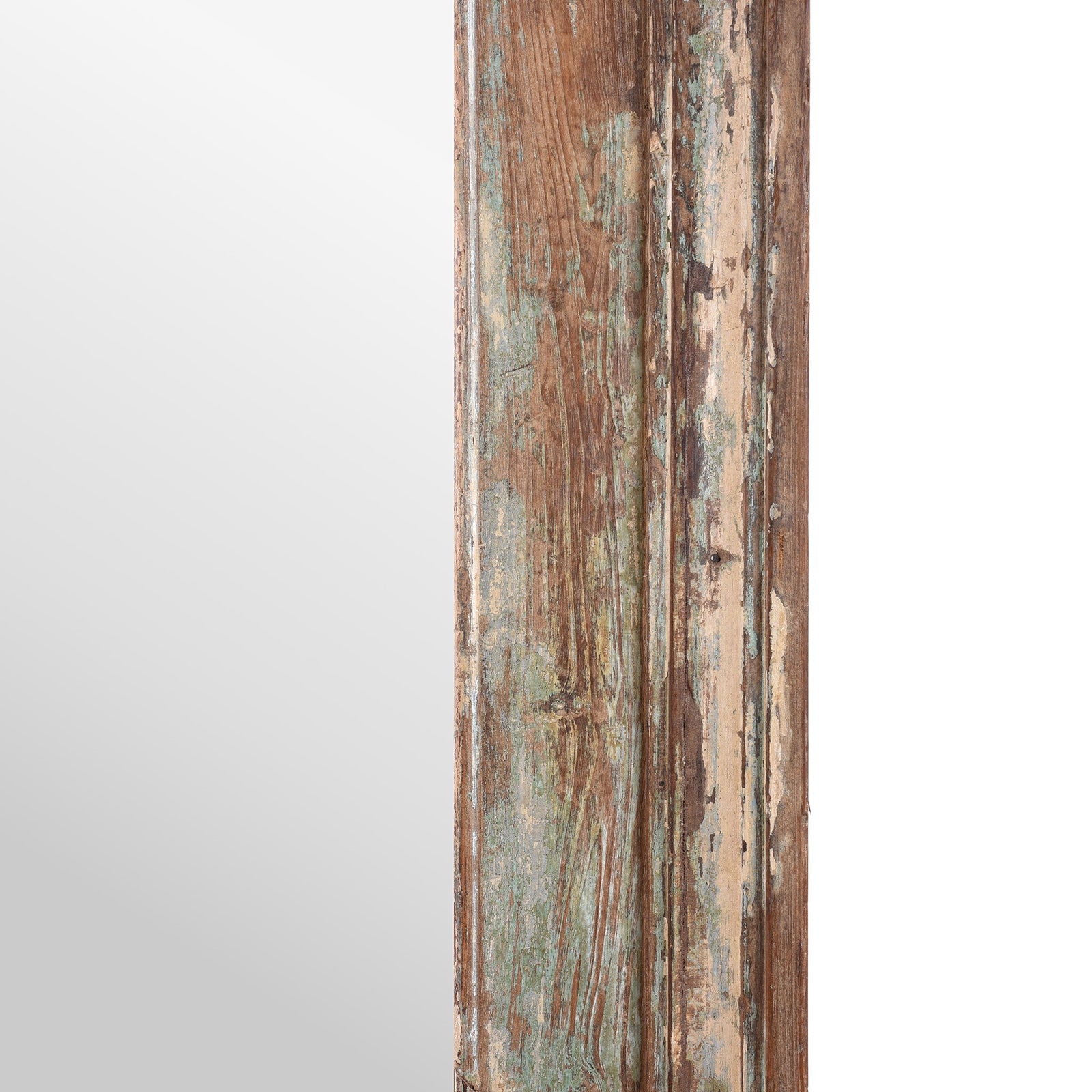 This striking mirror is framed in reclaimed teak, salvaged from a 19th-century building in Gujarat, India. Its timeworn surface retains traces of the original green paint, beautifully weathered through age, which adds depth and character to its simple yet elegant form. The natural patina of the wood, combined with hints of colour, tells the story of generations past while bringing warmth and authenticity into a contemporary setting.