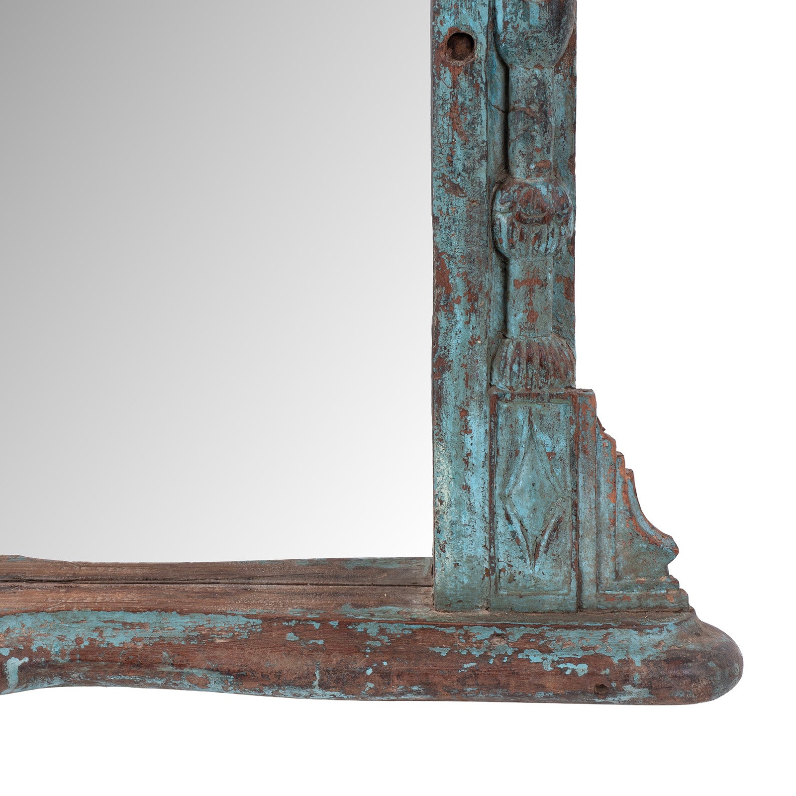 This characterful painted mirror has been created from an original 19th-century carved teak window frame, preserving the architectural charm and craftsmanship of historic Indian design. The frame is detailed with scrolling floral carvings, rounded vertical elements, and decorative corner brackets. Layers of worn turquoise paint reveal the teak beneath, giving the piece a beautifully aged patina.