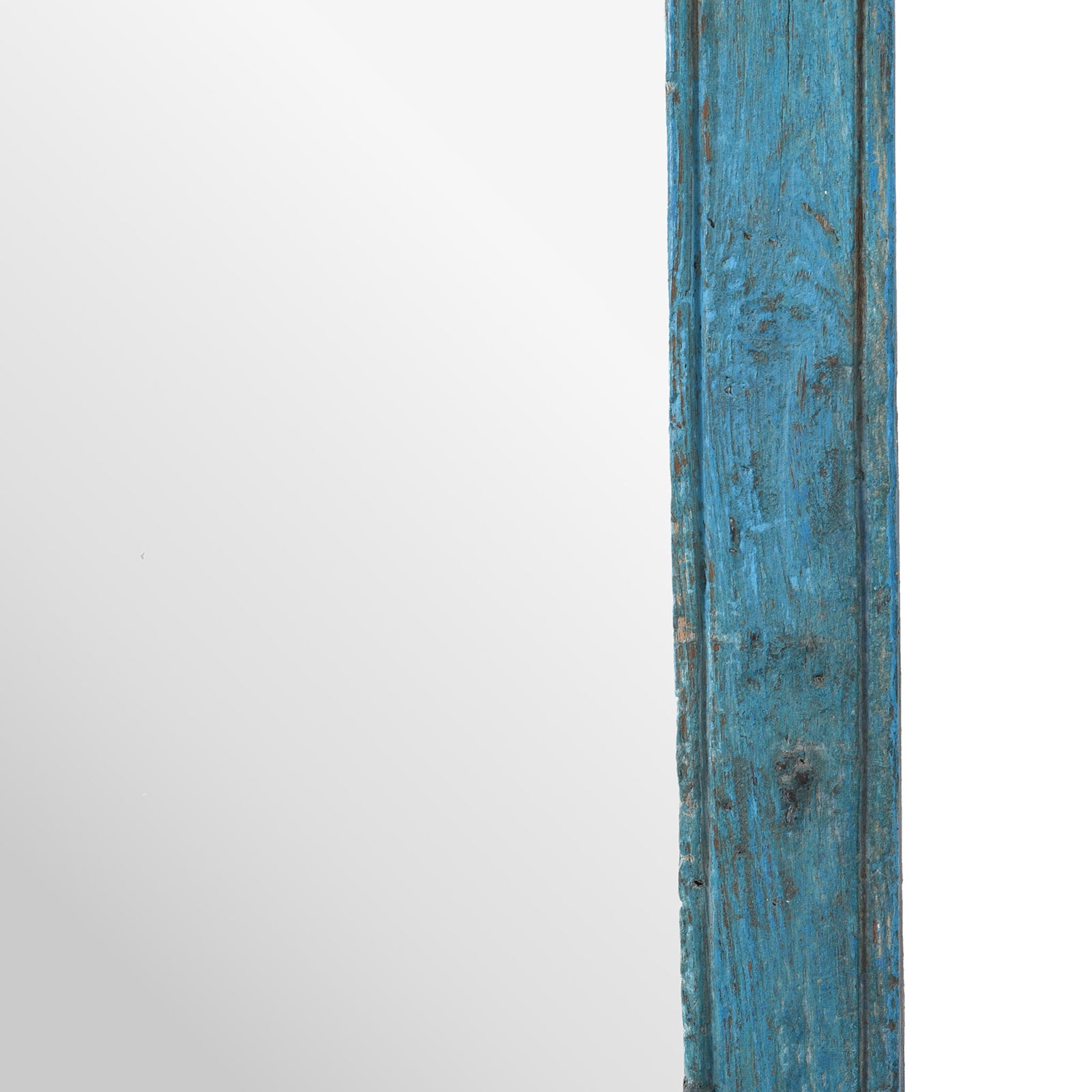 Once part of an opulent haveli in Madhya Pradesh, this striking mirror began life as a carved teak window frame. Its rich blue patina and exquisitely detailed parrot carvings speak to the high craftsmanship of Northern India. The scalloped mihrab arch, a hallmark of Mughal design, lends the piece a majestic architectural quality€”transforming a functional object into a timeless decorative statement.