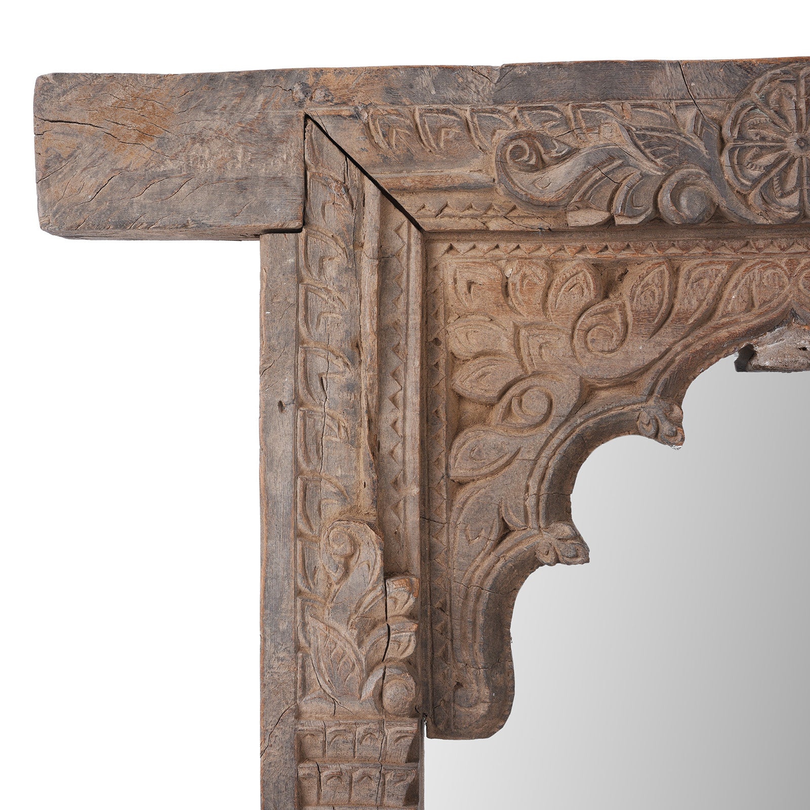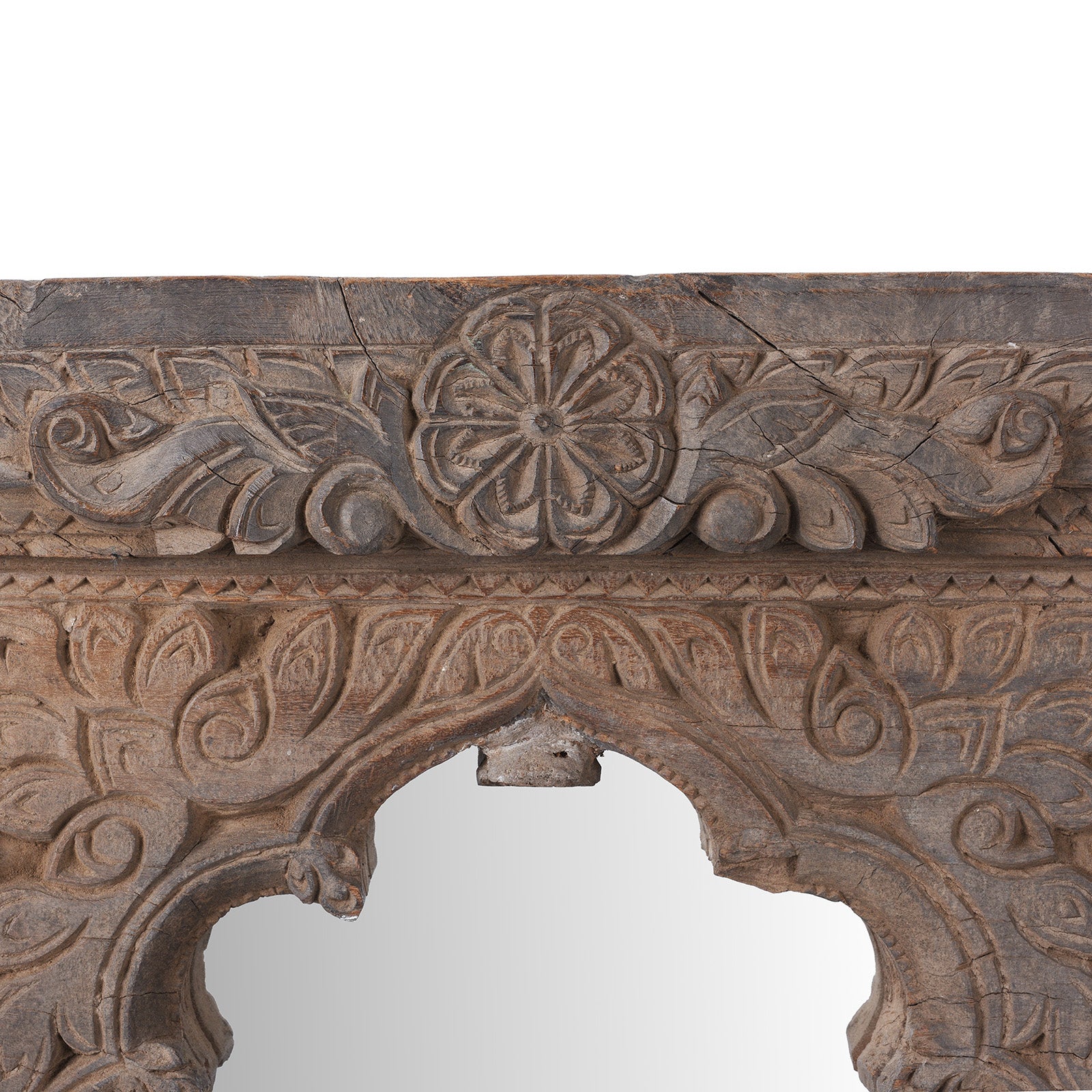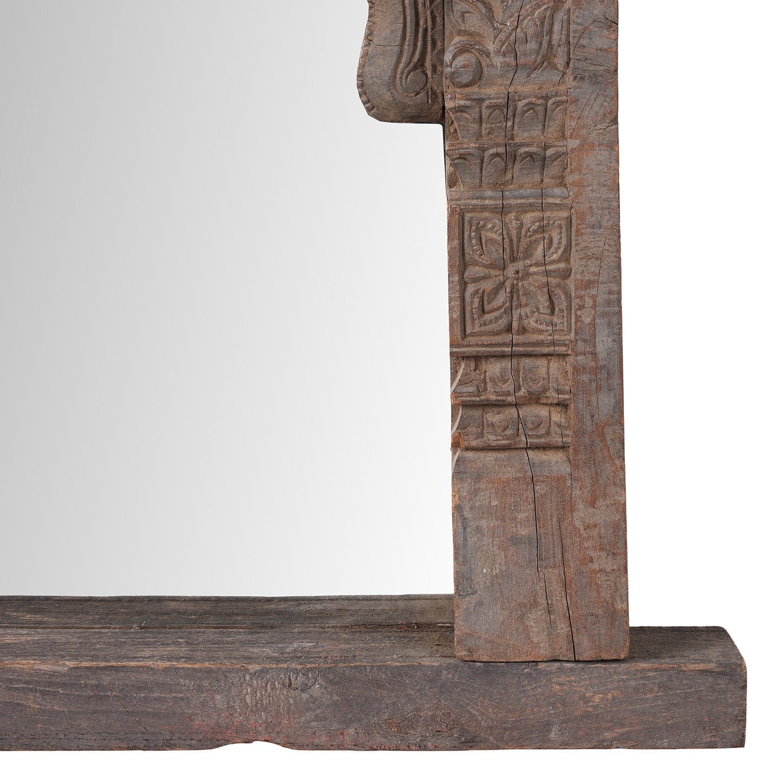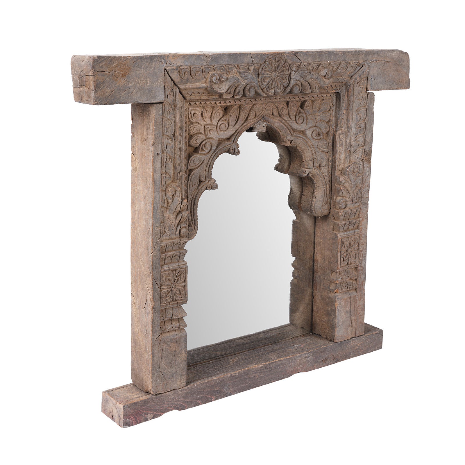 This beautifully carved teak mirror began life as an original 19th-century window frame from Andhra Pradesh, South India. The frame displays intricate hand-carved detailing, including foliate motifs, geometric blocks, and an elegant arched opening influenced by the region’s temple and vernacular architectural forms. Its naturally weathered surface, softened by time, highlights the depth and craftsmanship of the carving.