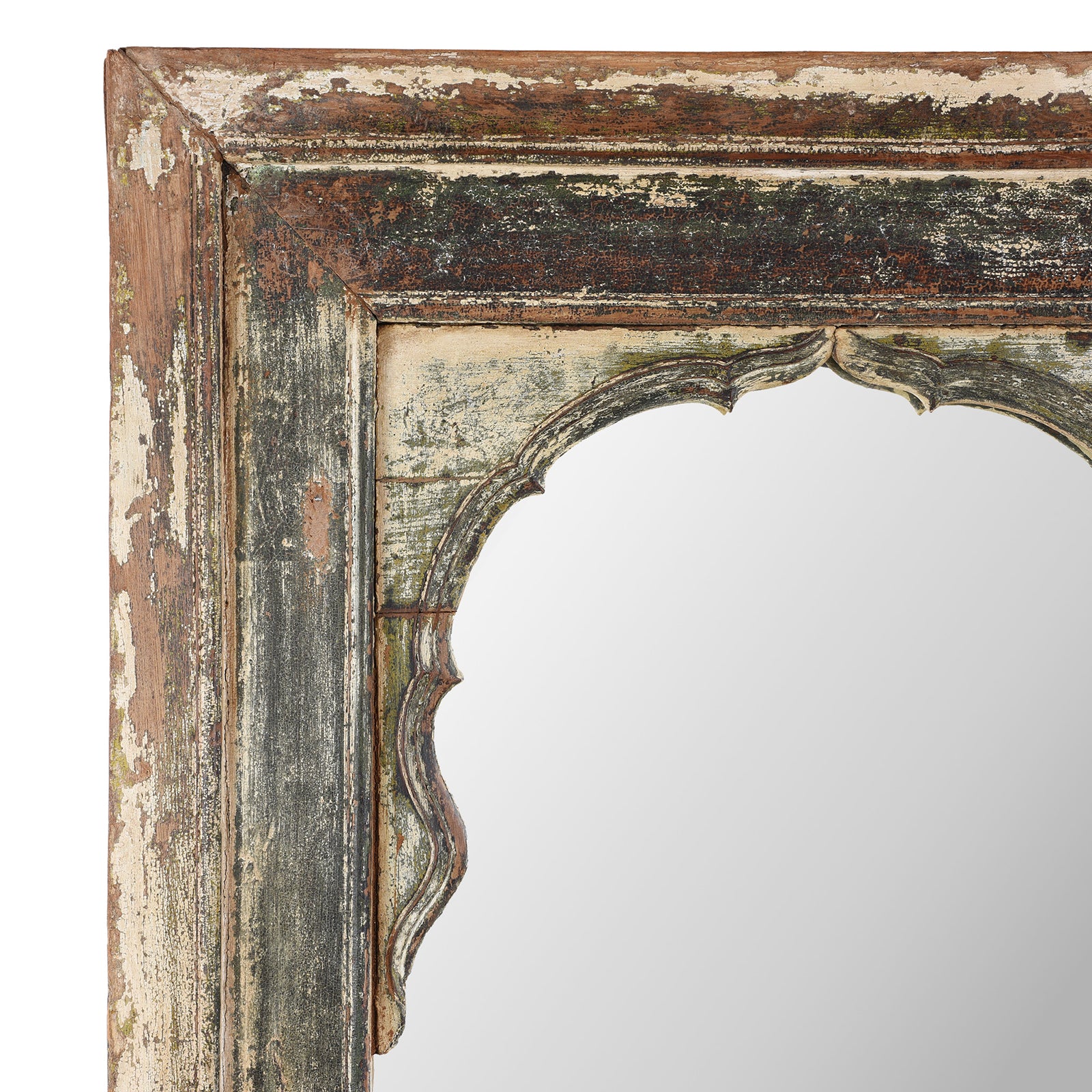 Antique Teak Haveli Window Frame Mirror With Distressed Paint And Mughal Arch Design