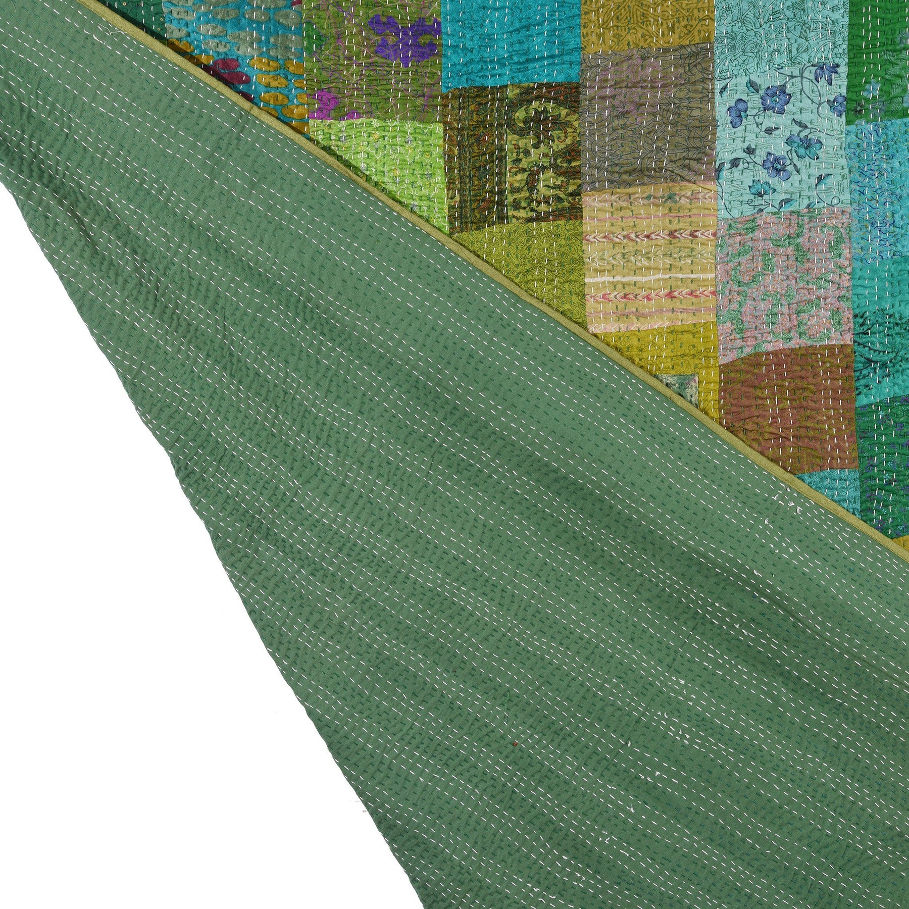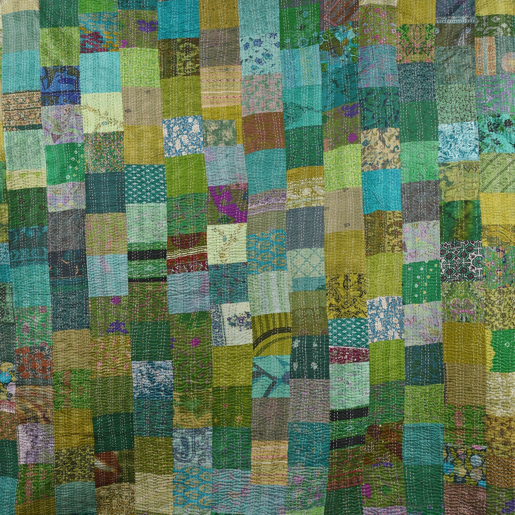 Kantha patchwork bedspread made from silk patola saris with a cotton backing.