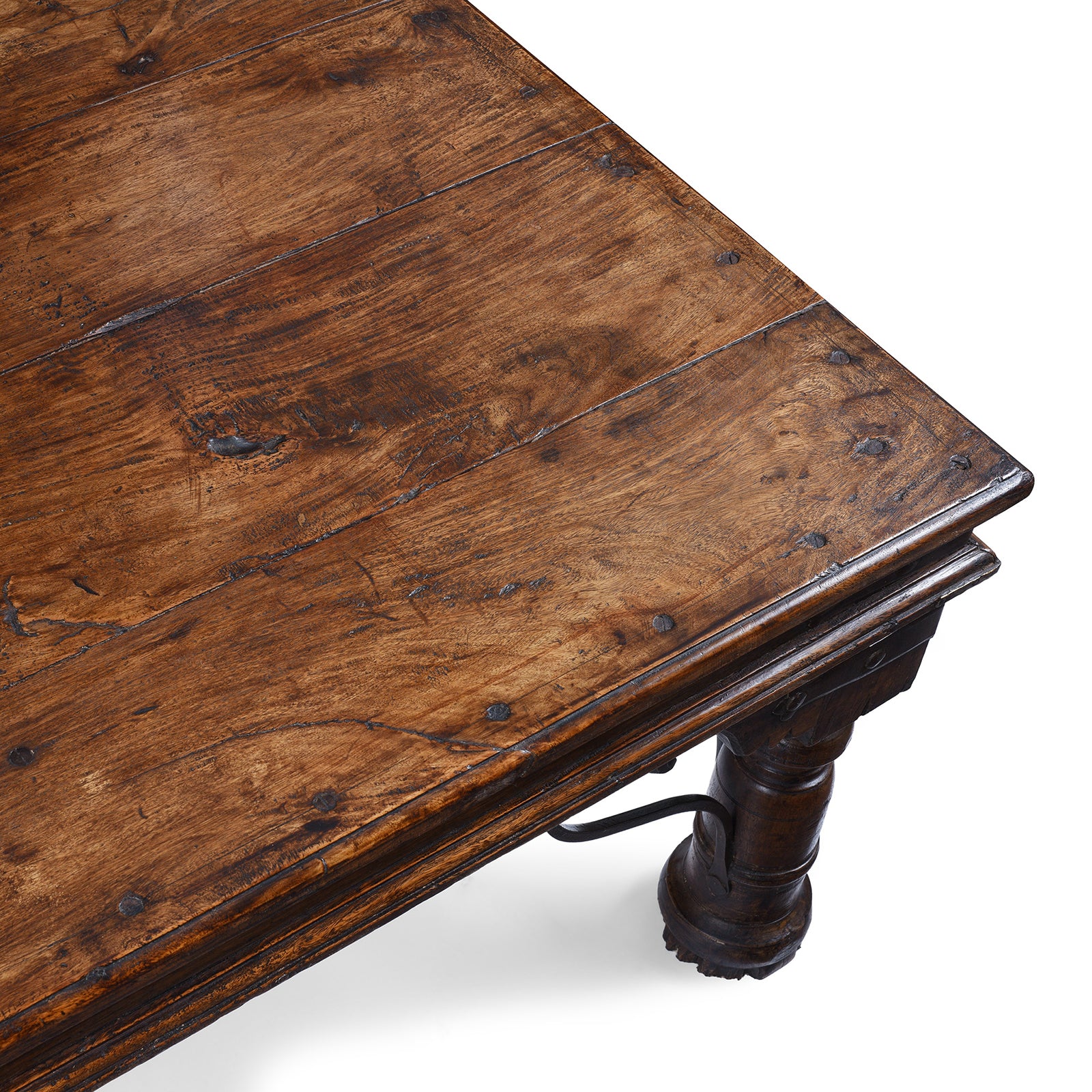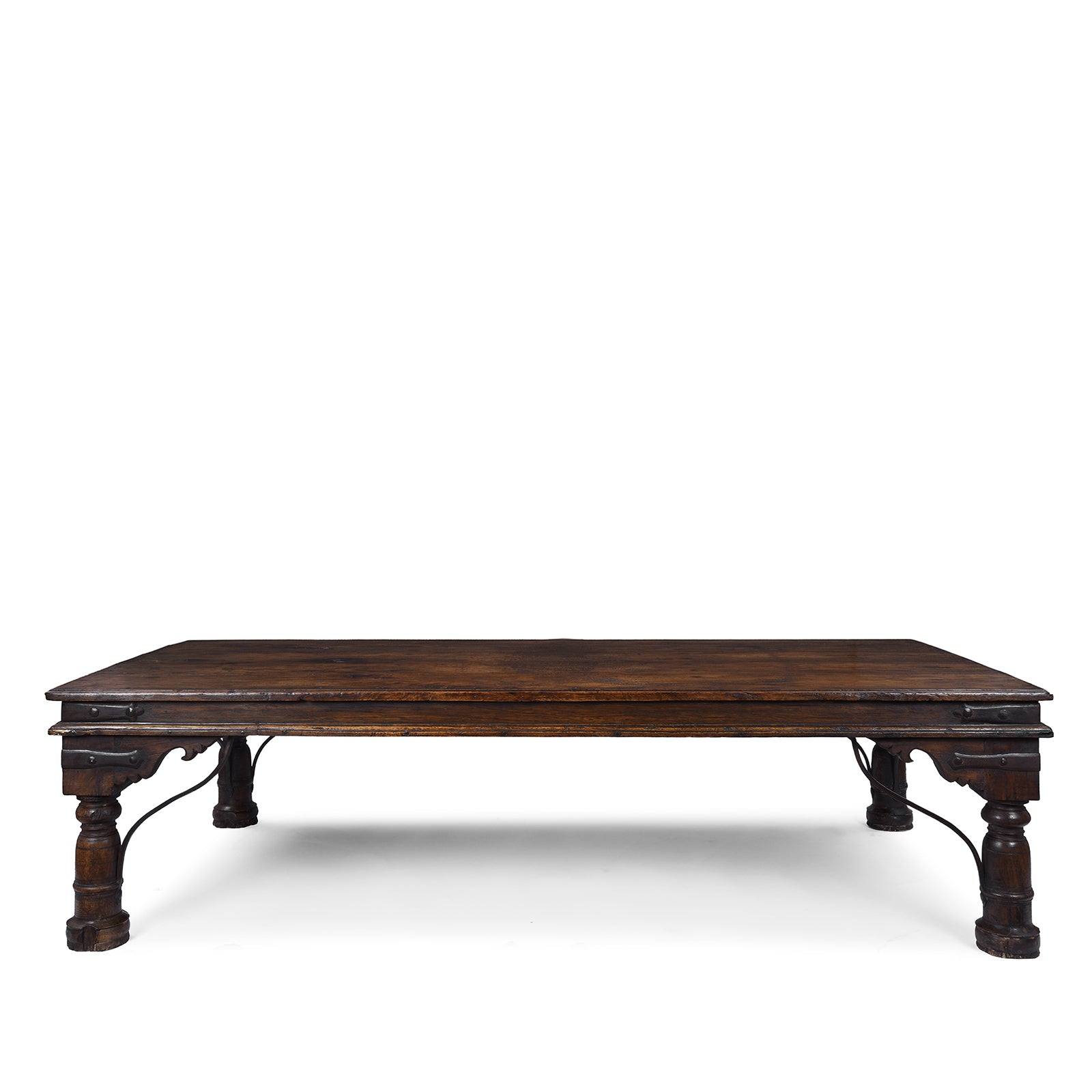 This antique takhat from Shekhawati, Rajasthan, dates to the 19th century and represents the robust, architectural craftsmanship of the region’s merchant homes. Originally a multifunctional daybed used for reclining or entertaining guests, it has been sympathetically adapted as a large and characterful coffee table.