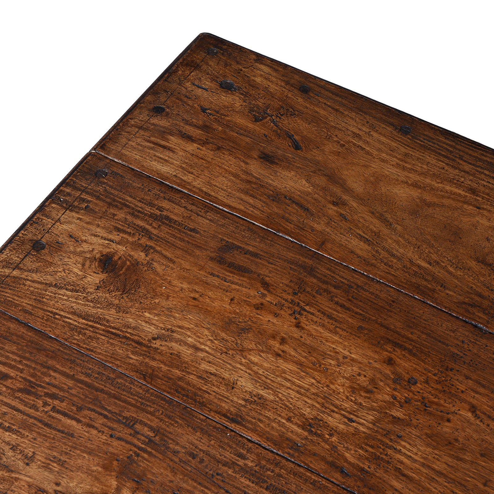 Constructed from roheda wood — a dense, durable hardwood native to Rajasthan — the piece has developed a rich, deep patina through years of use. Its thick plank top is secured with hand-forged iron straps, while turned legs and graceful iron stretchers lend both strength and elegance. Along one side runs an incised Gujarati inscription reading “Shubh Labh” (Auspiciousness and Prosperity), a traditional blessing found on furniture and lintels of merchant households, invoking good fortune and success. The use of Gujarati script reflects the historic trade connections between Shekhawati merchants and the prosperous commercial centres of Gujarat, where many Marwari families maintained business houses and adopted Gujarati as a language of commerce.