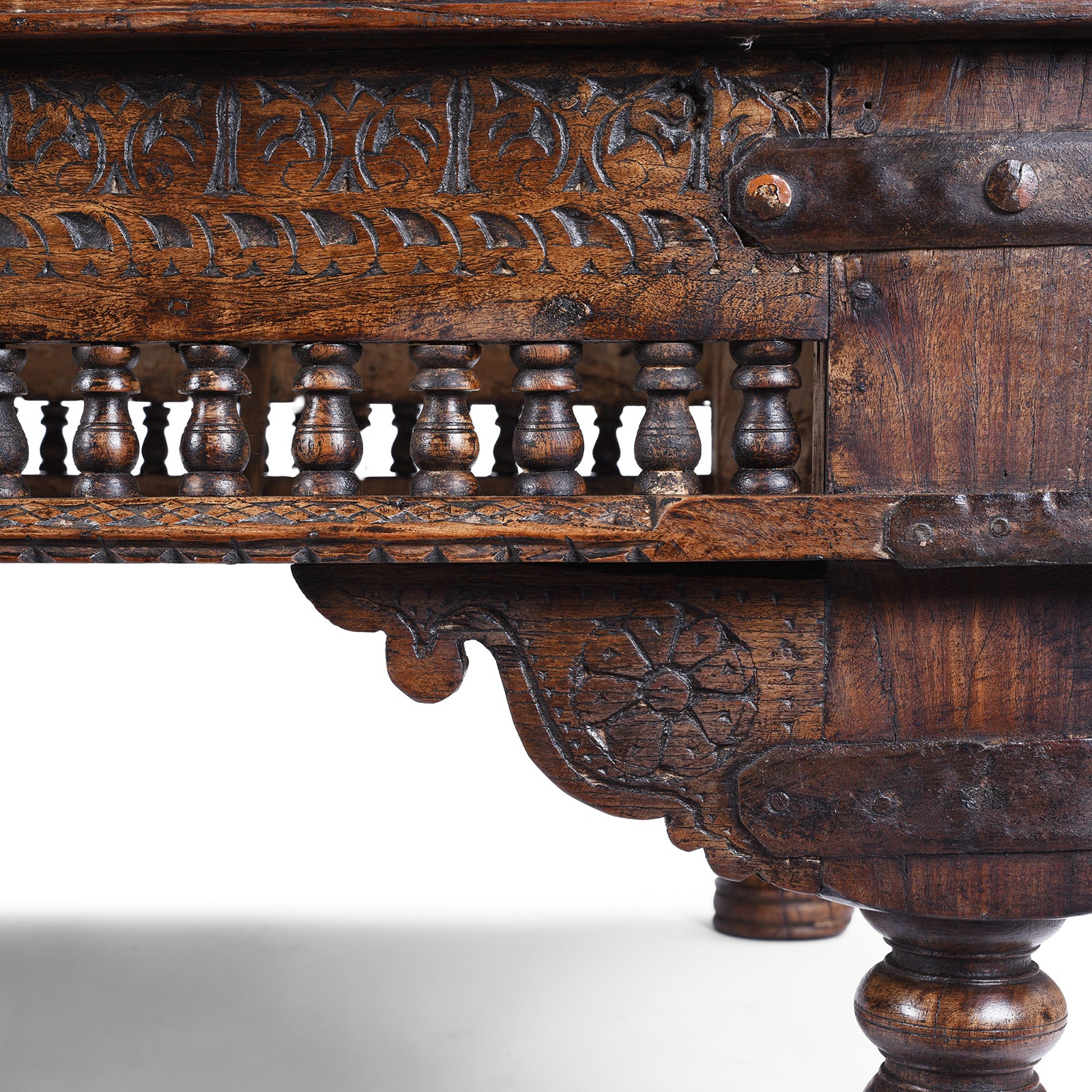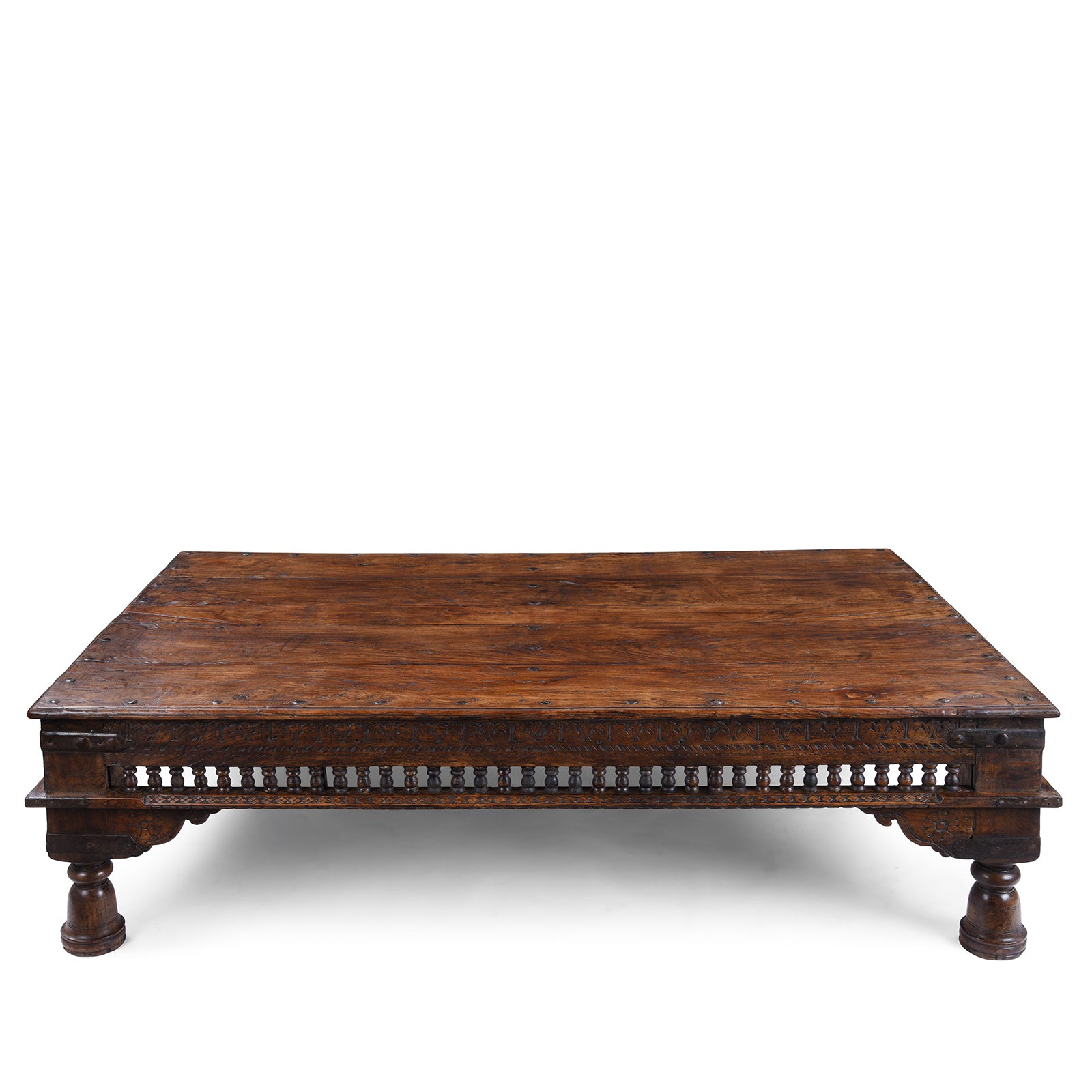 Originally made as a luxurious daybed for the wealthy merchant families of Rajasthan, this impressive 19th century Indian takhat has been beautifully repurposed as a richly characterful coffee table. From the Shekhawati region, it embodies the craftsmanship and decorative detailing for which this area is celebrated—strong, architectural proportions paired with finely worked carving and an inviting, timeworn patina.