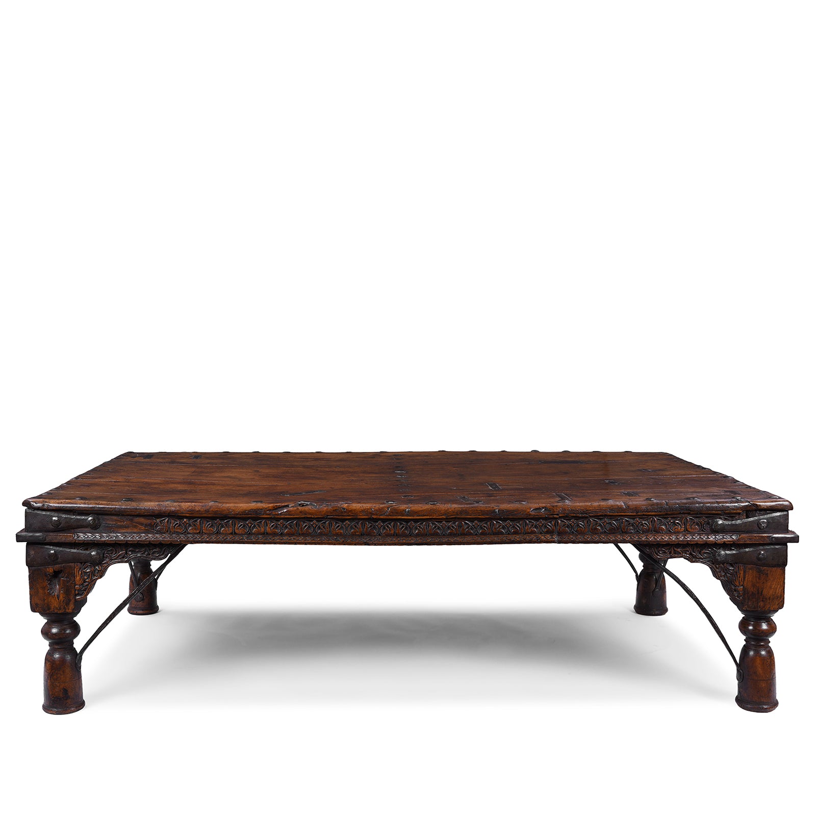 This magnificent antique Indian takhat—a traditional daybed from Rajasthan—has been beautifully repurposed as a coffee table. Originating from the Shekhawati region and dating to the 19th century, it is crafted from organic roheda wood, a dense variety of teak prized for its strength and deep, warm tone. The table retains exquisite hand-carved floral detailing along its apron, complemented by the rich patina that has developed over more than a century of use.