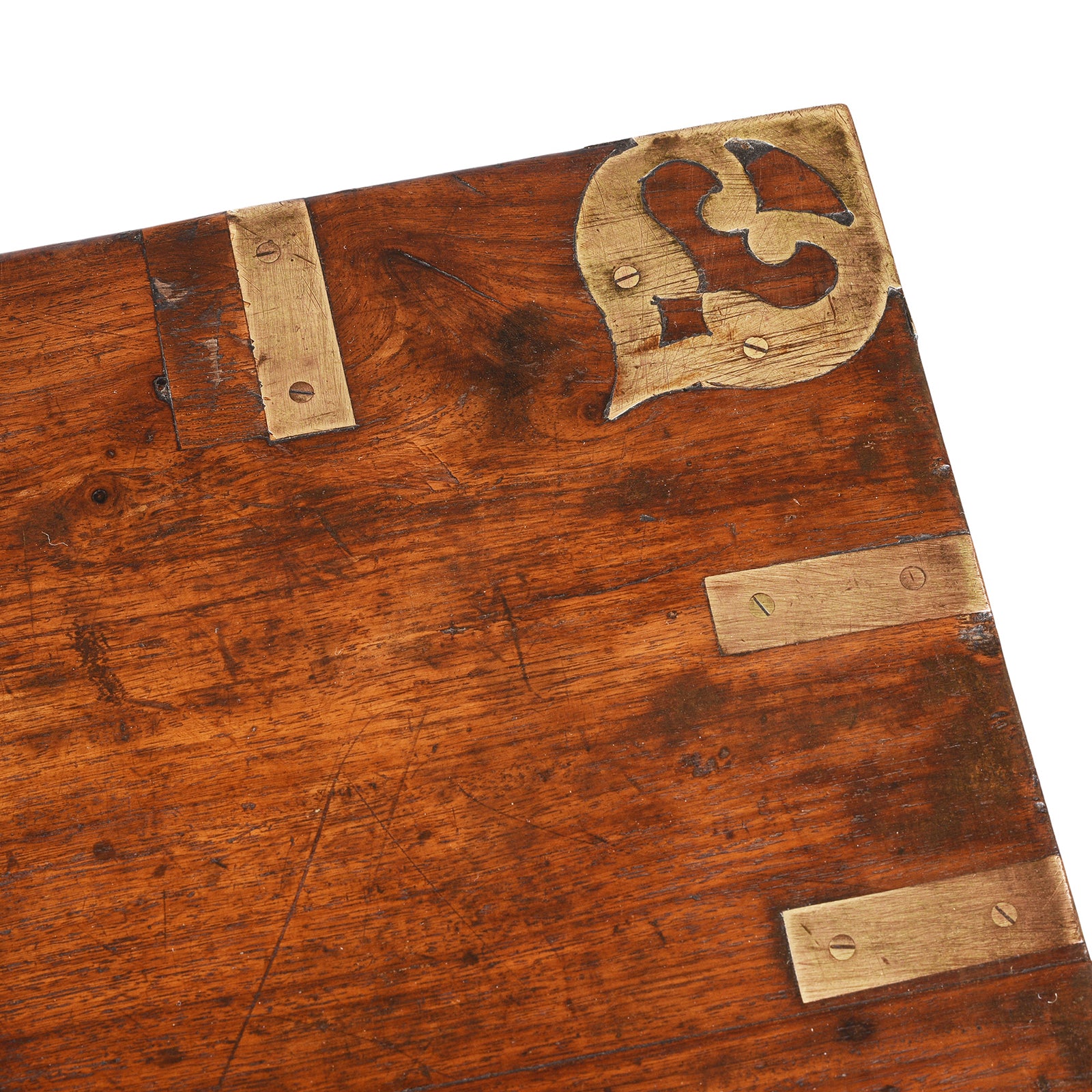 This antique Indian brass bound merchant box dates to the 19th century. Constructed from teak wood this box features its original brass fittings and latch. The lid of the box is adorned with decorative metalwork.