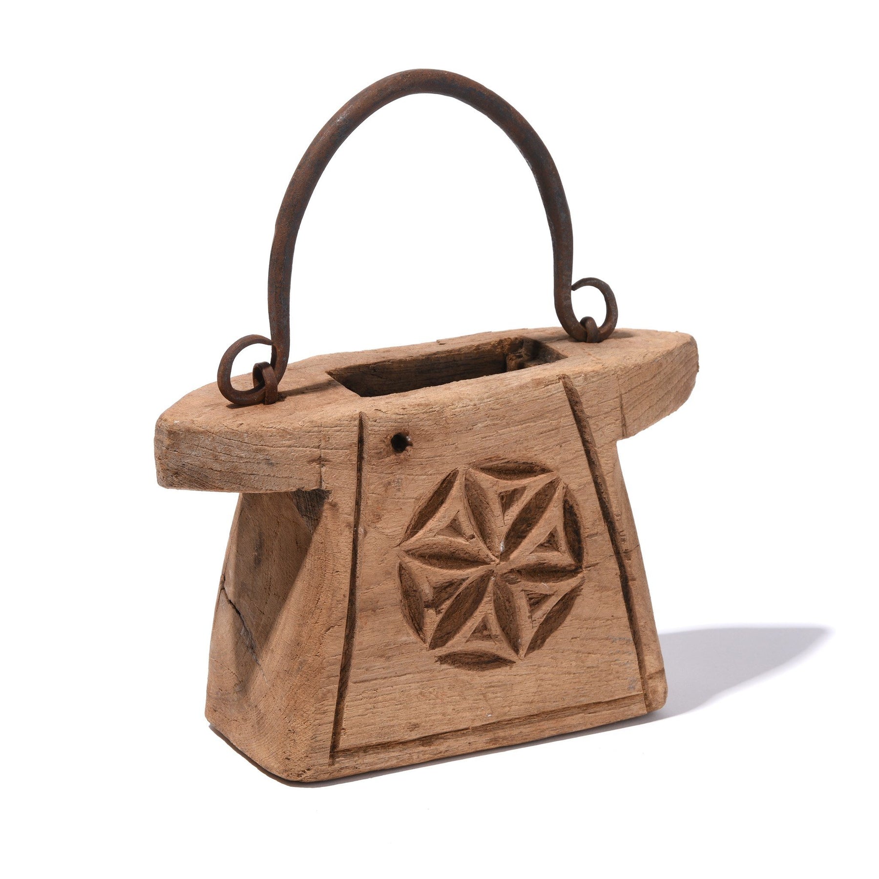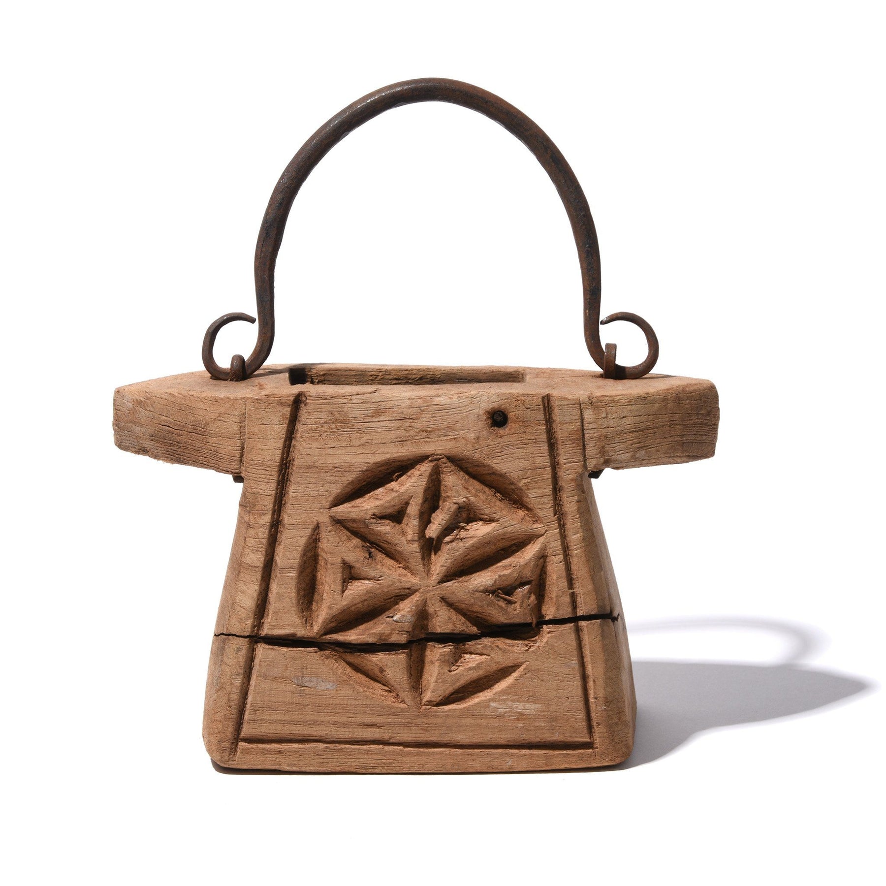 These old pots come from South Rajasthan and Madhya Pradesh. They are carved from teak with blacksmith forged iron fittings. They were normally used in the kitchen for storing  cooking ghee - sometimes used by the bullock cart drivers to store grease for the axle. Seldom used in Indian kitchens in these times of modern materials, a perfect gift for a collector of village art, each one is unique.