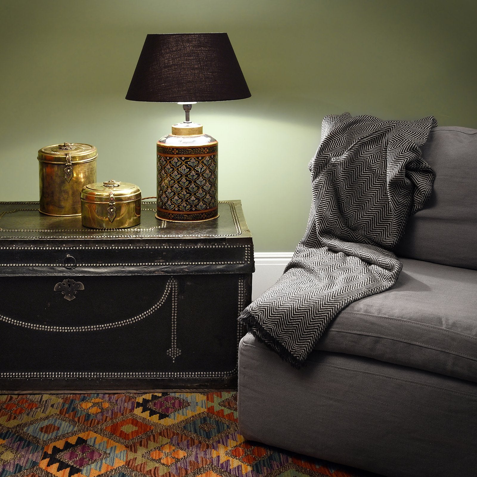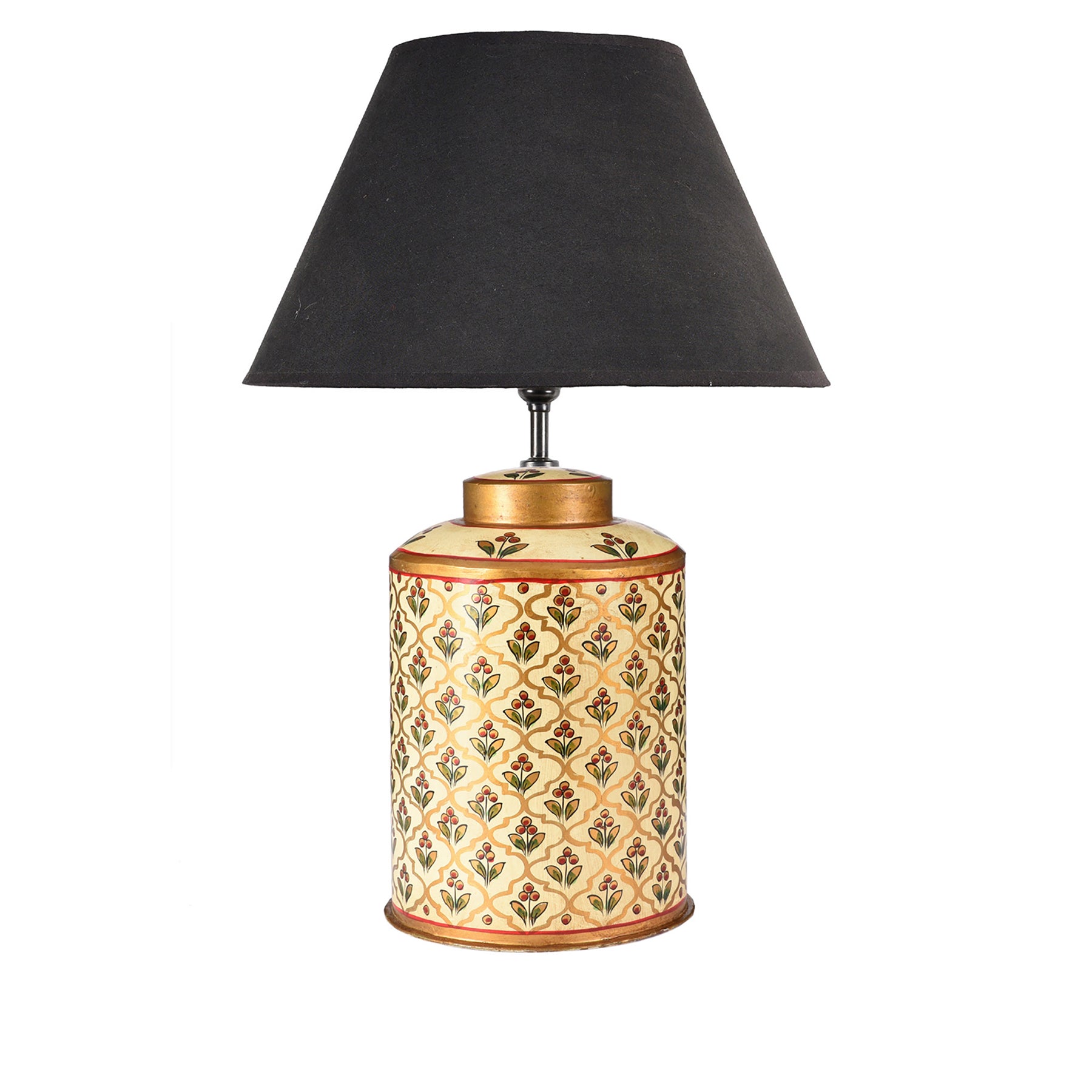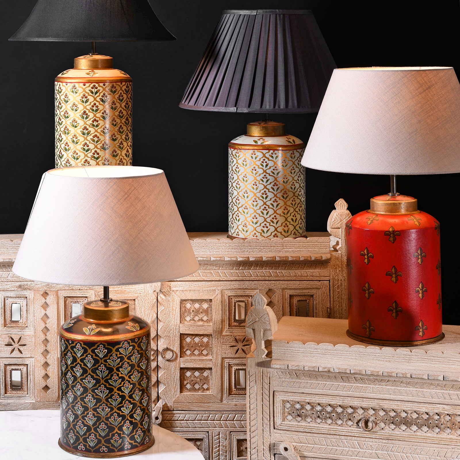 Iron toleware lamp inspired by the tea caddies of the classic British Regency period. These toleware table lamp bases are expertly handmade in small workshops in Rajasthan.