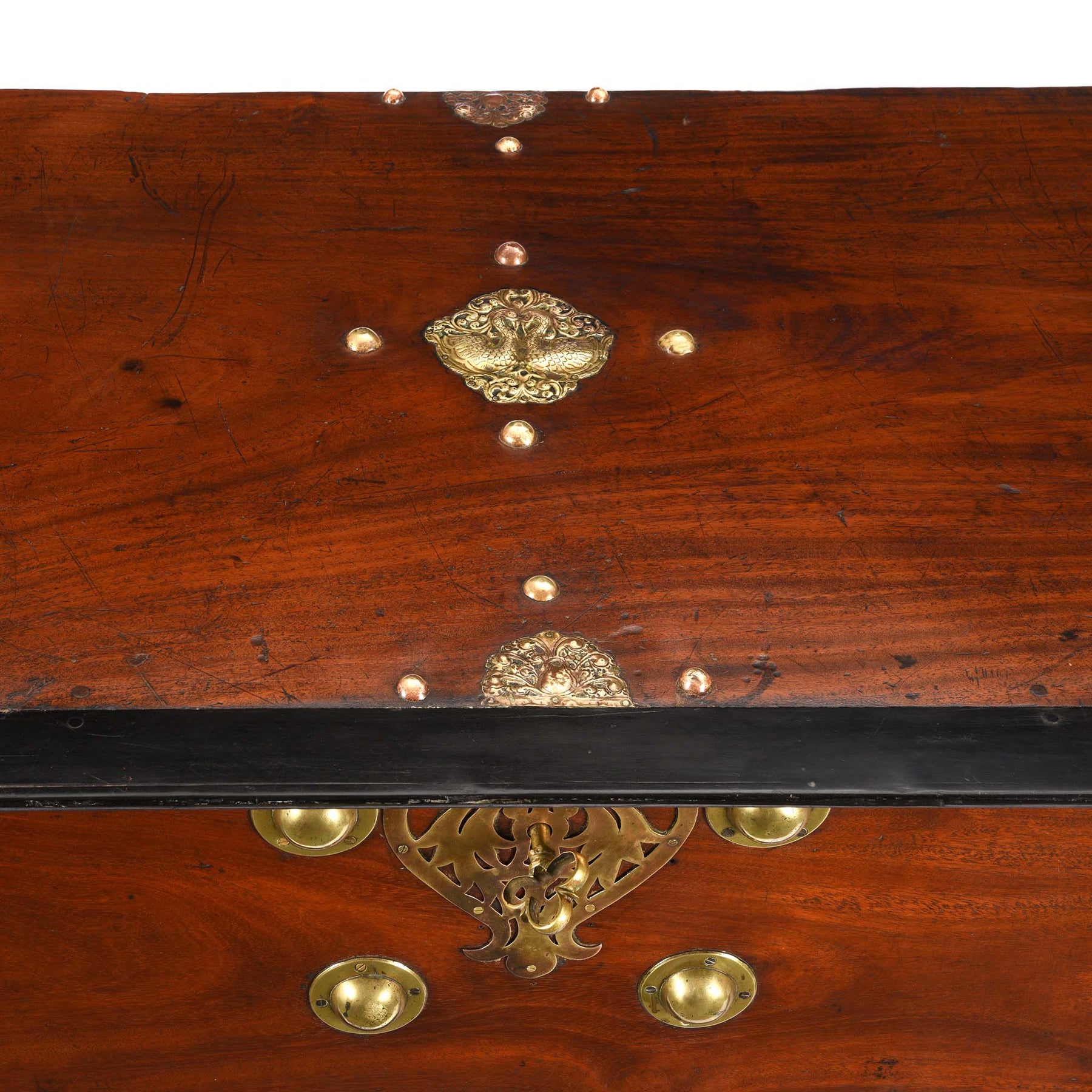 This majestic Indo-Dutch chest harks back to the colonial days and the 'Spice Wars'. Originally from colonial Ceylon (modern-day Sri-Lanka), it dates from the middle of the 18th century. It is beautifully constructed from jackfruit wood with ebony trim and beading. The intricate and flamboyant brass decoration makes this chest incredibly striking. It is an exceptional example of Indo-Dutch furniture and would have been owned by a wealthy trader travelling between Sri-Lanka, South India and Europe.