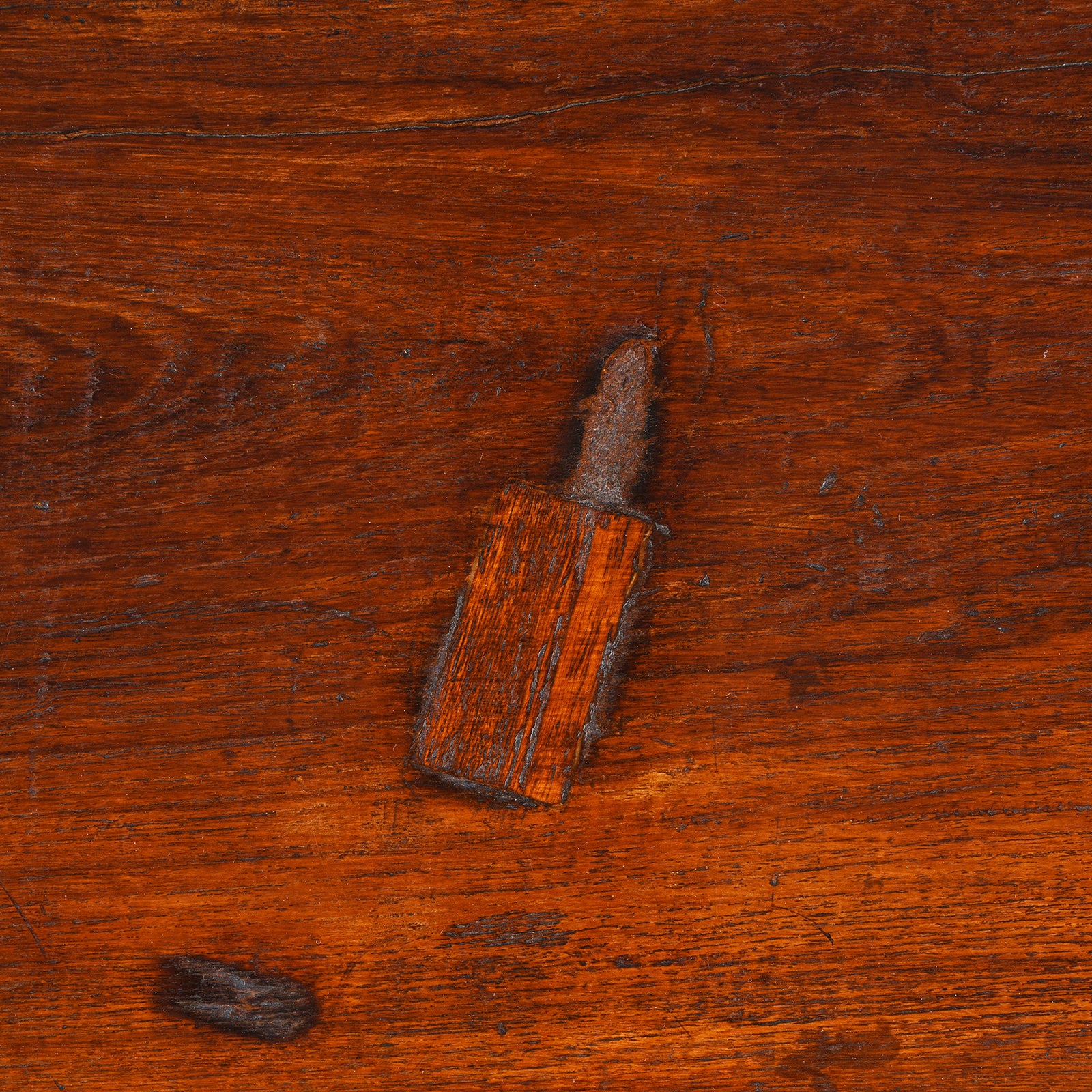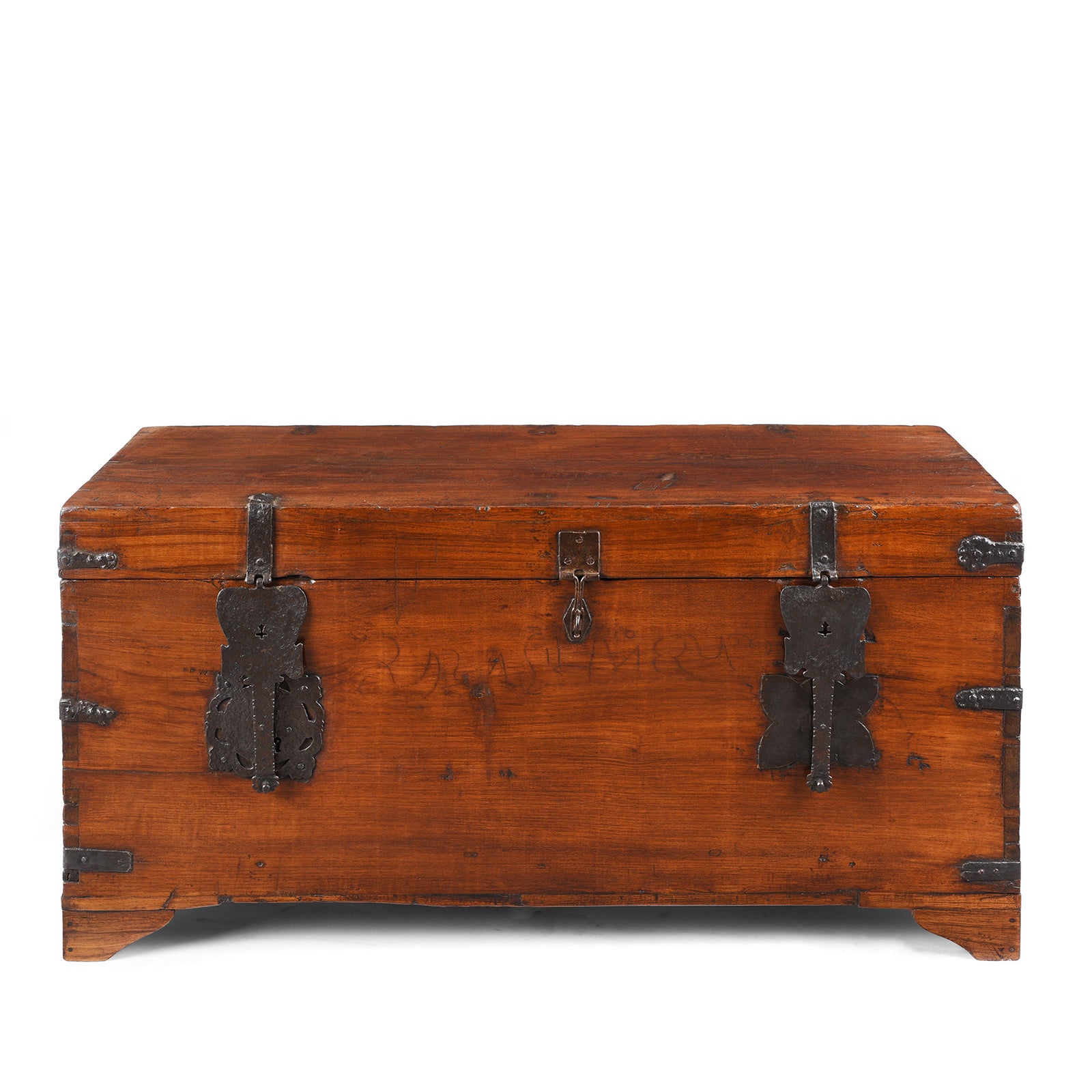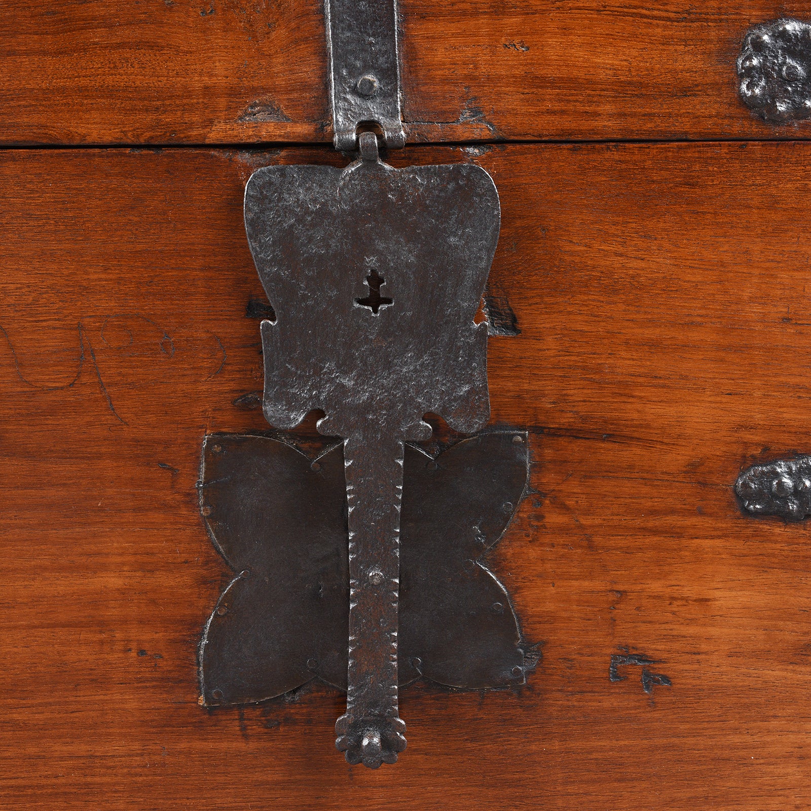 This is an unusual antique Indian chest, it's constructed from forest teak and is from South India. The iron hasps are shaped somewhere between an elephant & an upside down guitar. This shape of hasp is an Indian interpretation of the Portuguese designs. Trunks made from forest teak are usually quite early as many of the teak forests were replaced with teak plantations in the 19th century, leading to more practical straighter grained, more planky wood. The front of this chest is inscribed with the name of a previous owner on the front, this piece has developed a wonderful patina over the years. A sturdy chain prevents the lid from falling open.