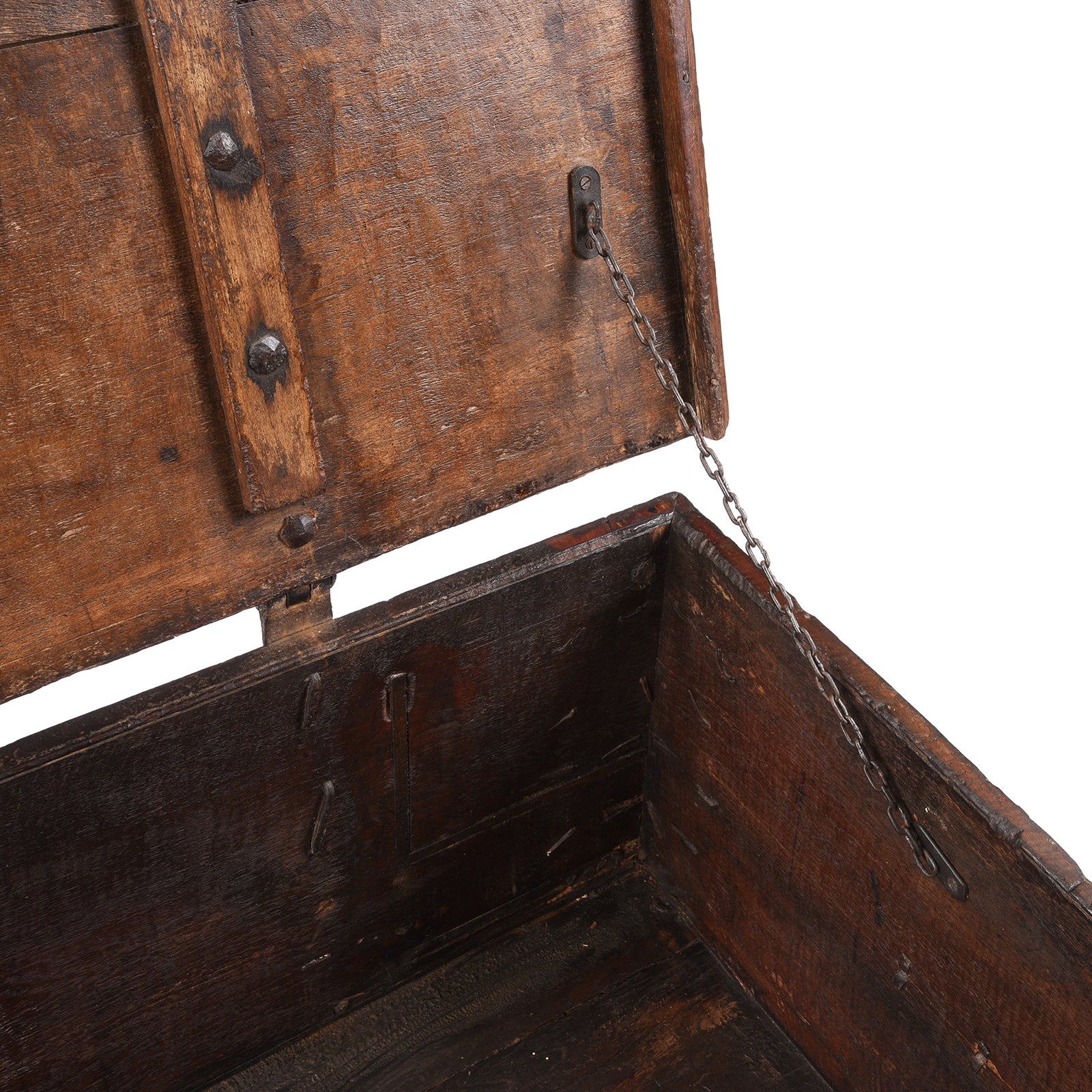 The interior consists of a large storage space. A sturdy iron chain prevents the lid from falling fully open.