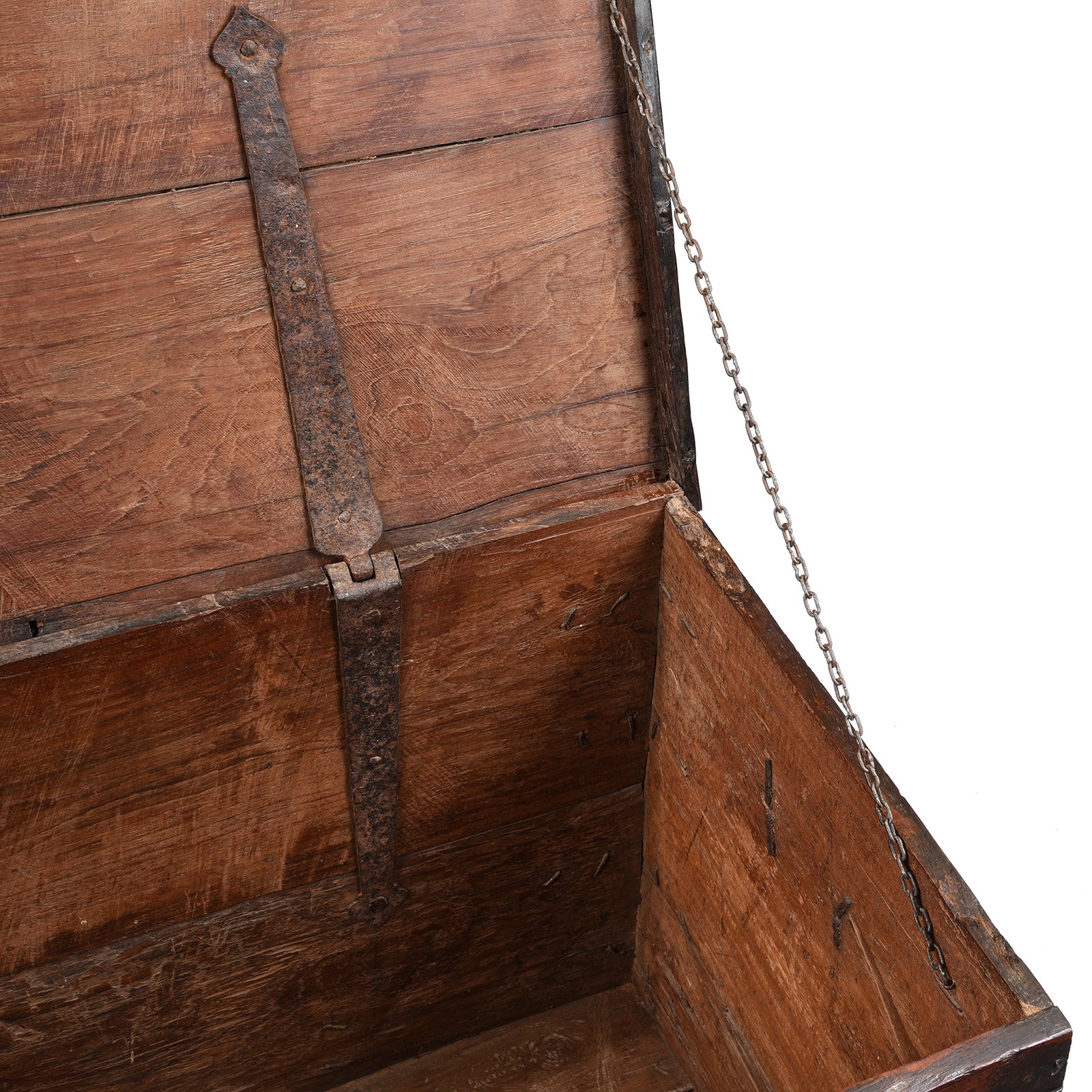 This beautifully patinated iron-bound chest is from Gujarat and dates to the early 19th century. It is constructed from teak wood. Most likely it was custom made for a wealthy family to stash away dowry, family treasures, or cash from the prying eyes of extended family members.