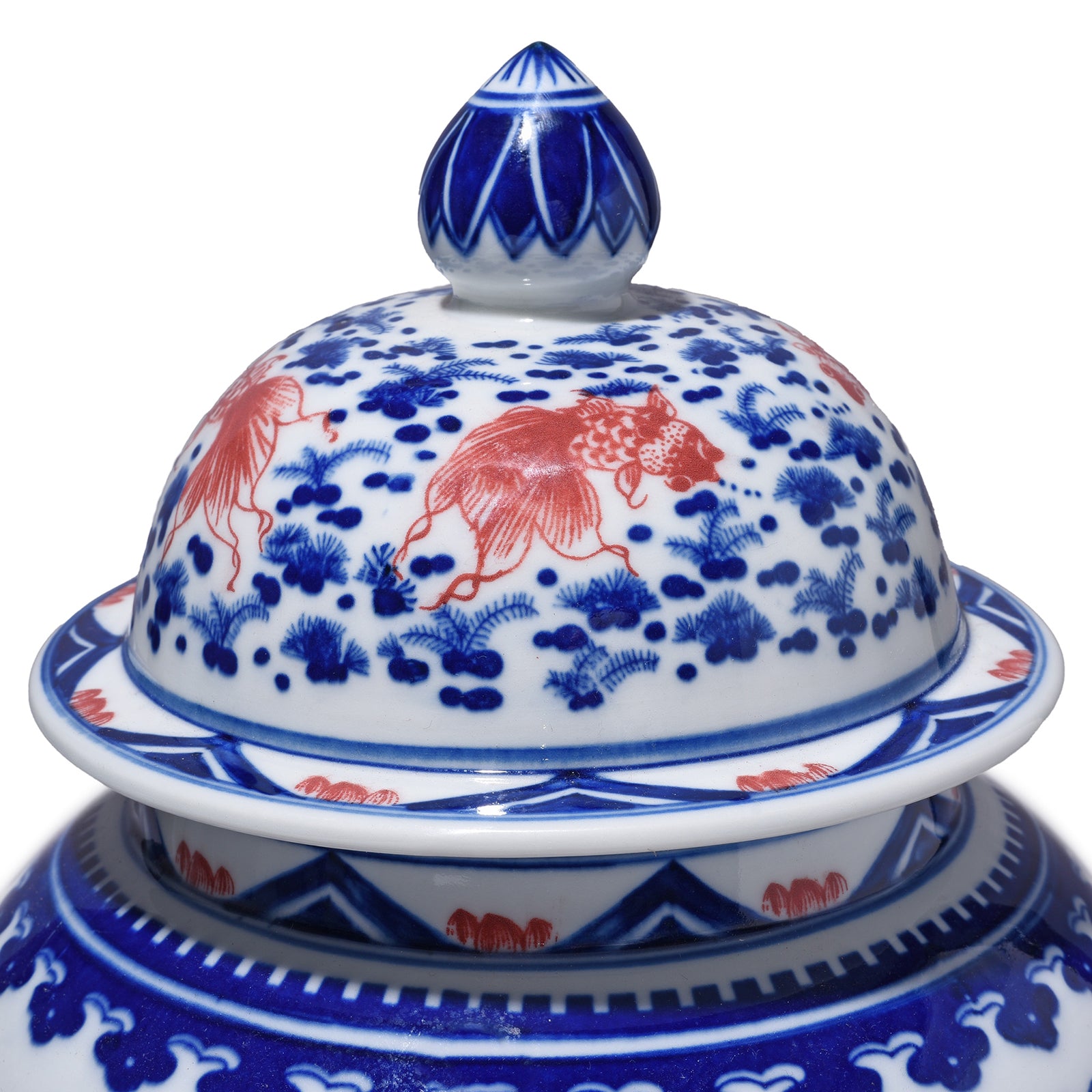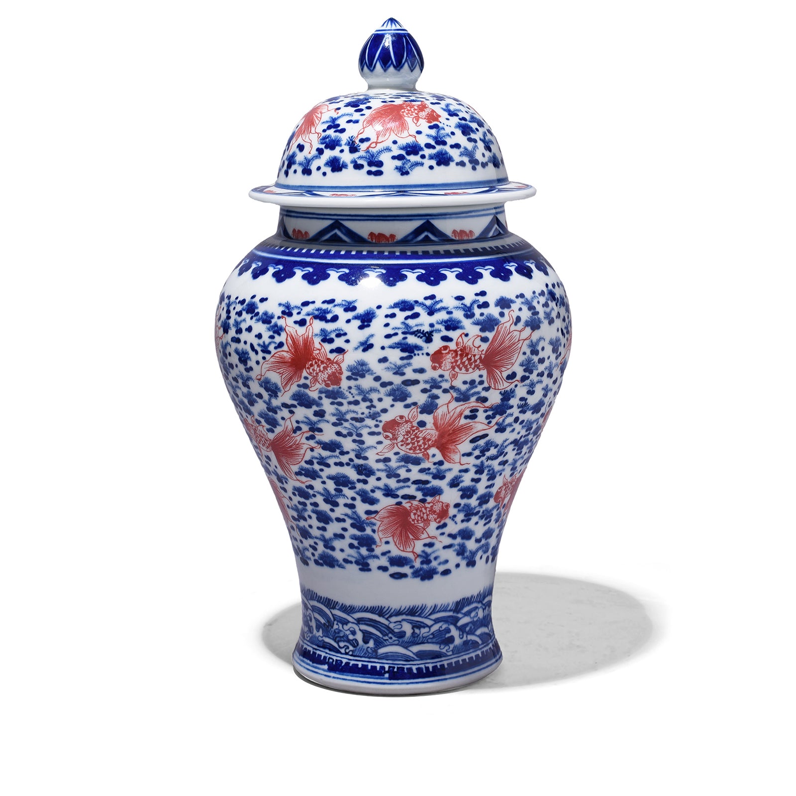 This reproduction Chinese blue & white temple jar has a delicate fish design painted in iron red. It is hand painted by skilled artists using traditional techniques learned from their family passed down through generations.