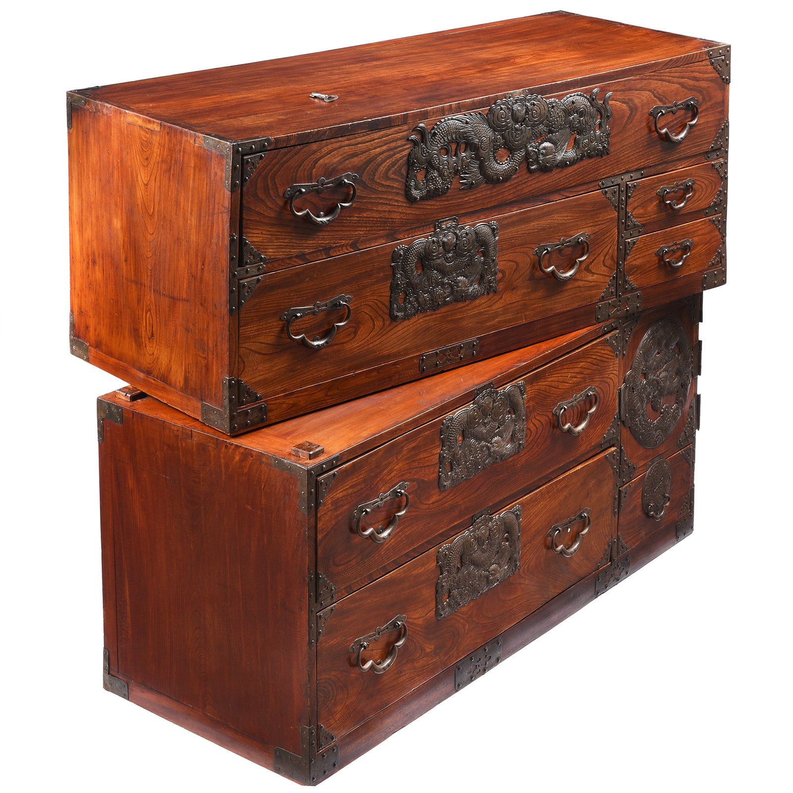 Antique Japanese Keyaki Kasane Dansu from Sendai Province With Dragon Ironwork Made from Zelkova Wood - Early 20thC | Indigo Antiques