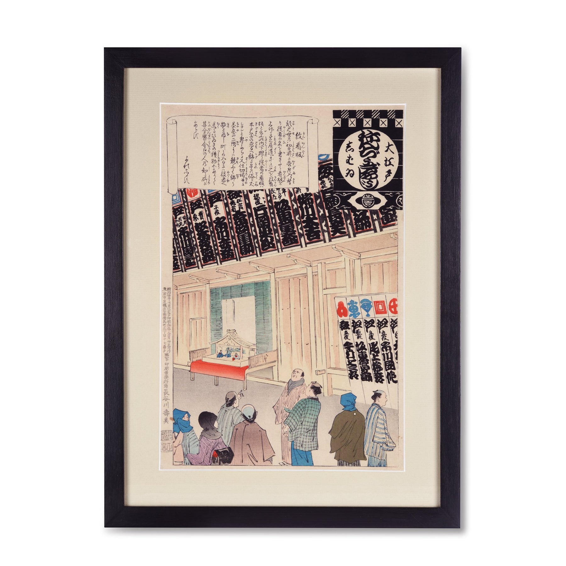 Japanese Woodblock Print. Depicting The Edo theatre. By Adachi Ginko (1873-1908). Supplied in a Matt Black Wooden Frame.