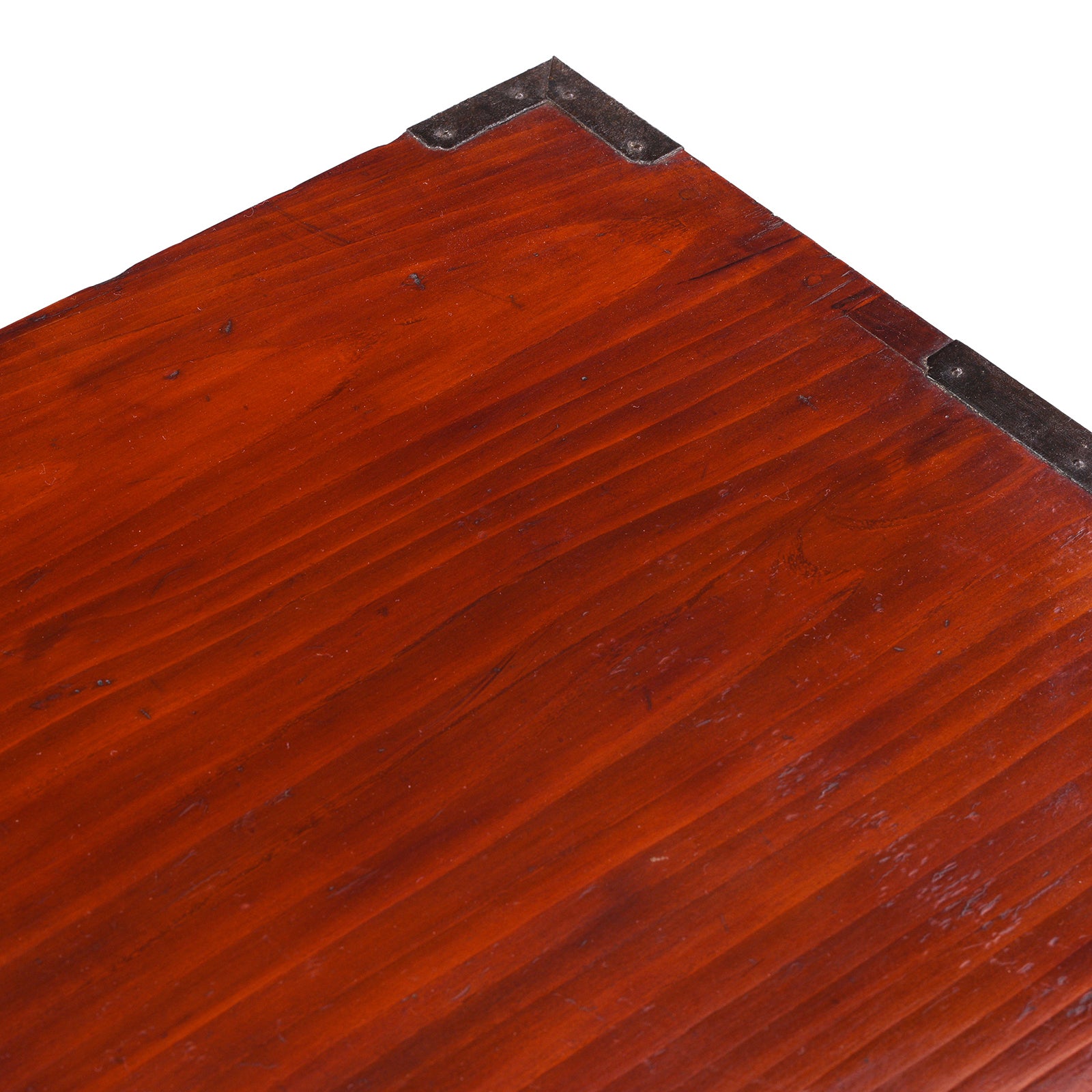 Crafted in the traditional way, this tansu would have been the collaborative work of three specialists: a carpenter, a lacquer worker, and an ironworker. Constructed from chestnut wood with a plywood back, it features four large drawers and two smaller drawers hidden behind a side door. The chest is finished with elaborate black iron hardware, contrasting beautifully with the rich natural lacquer of the wood. A practical yet elegant example of Japanese design, it retains its historic character while offering modern functionality for storage.