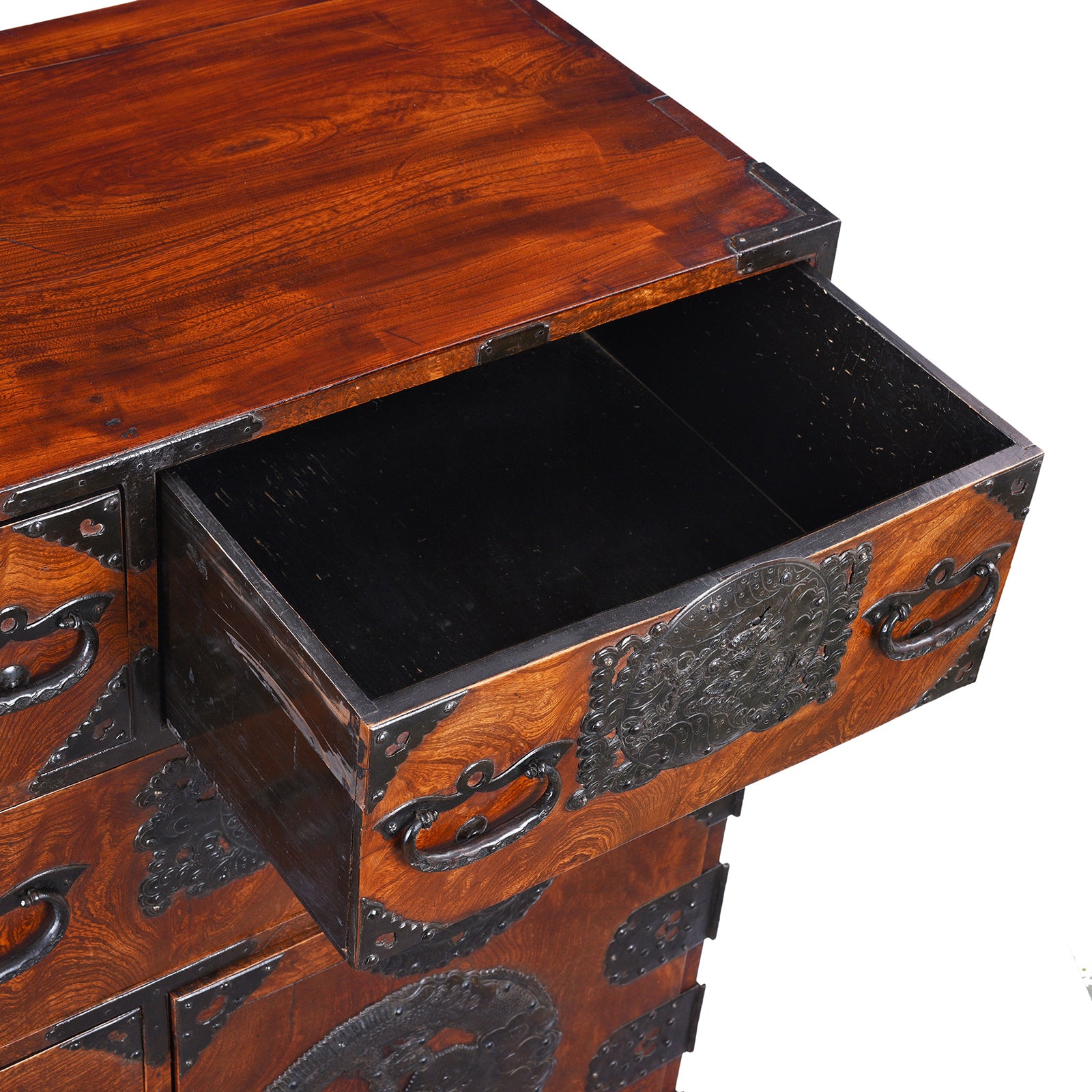This stunning Japanese Sendai Isho Dansu dates from circa 1910. Sendai tansu chests are the most decorative and impressive of all Japanese tansu chests. Crafted from solid keyaki (zelkova / red elm) with forged iron hardware.