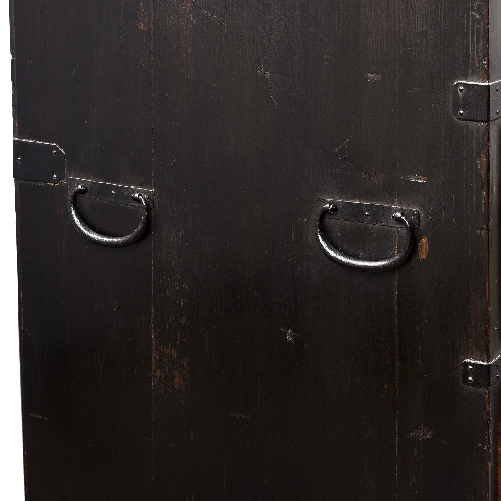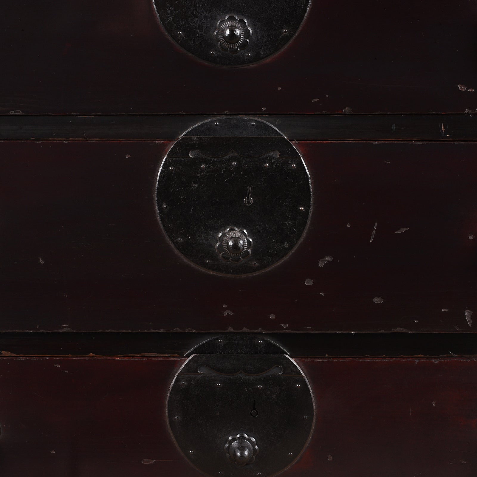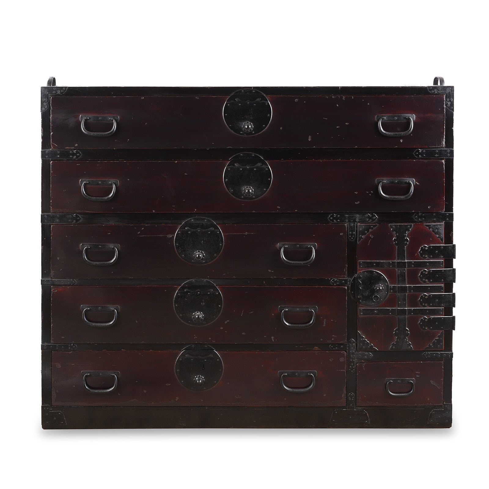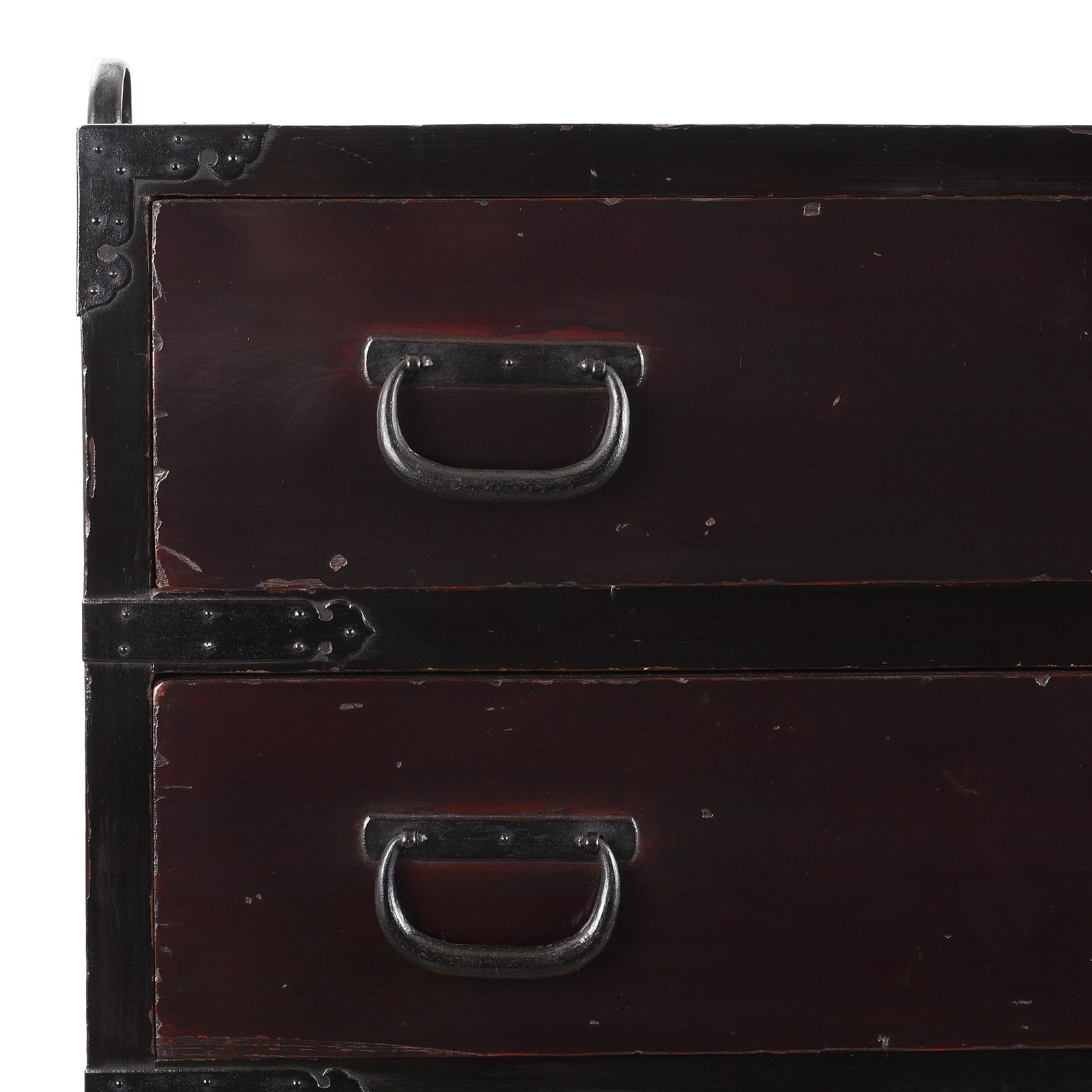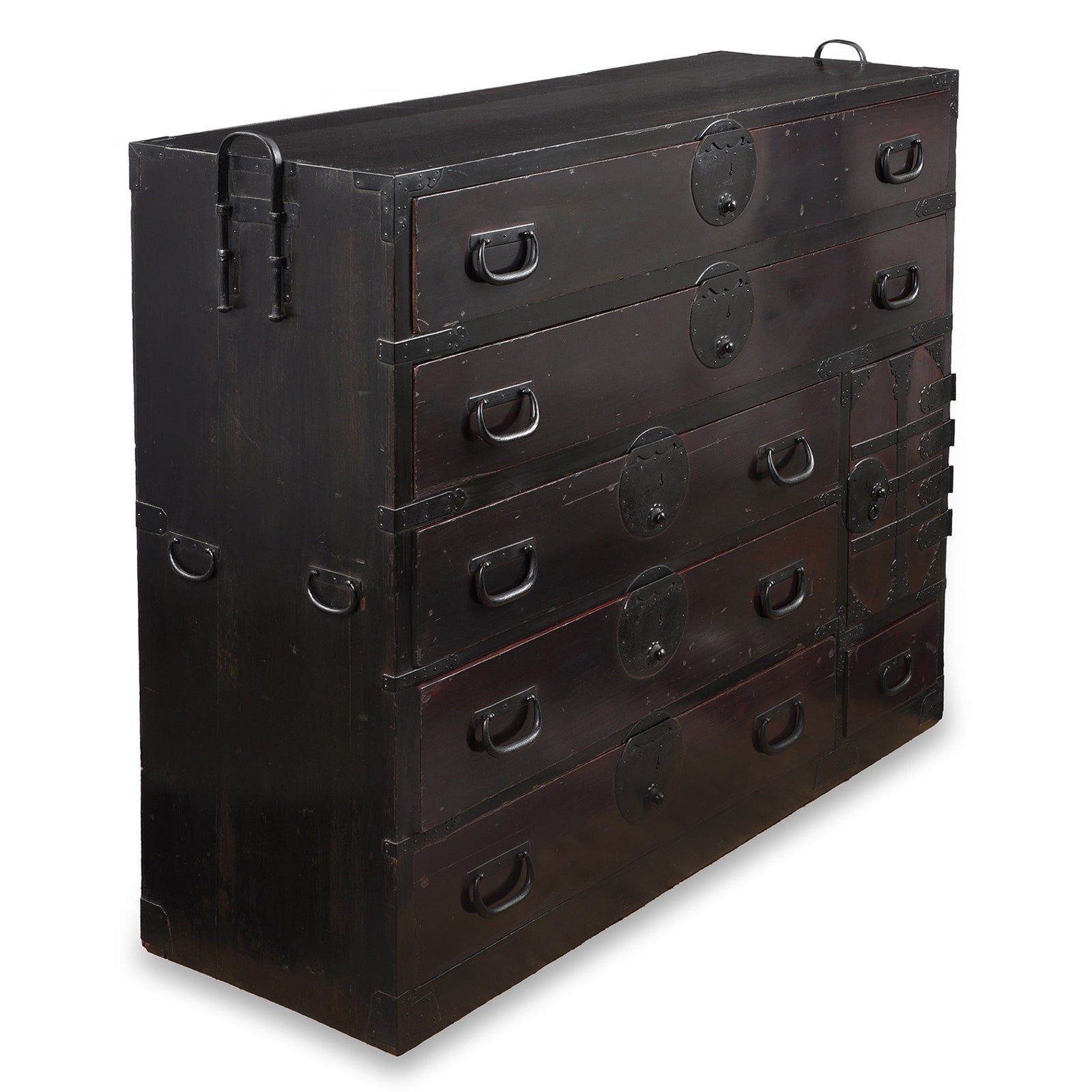 This antique Japanese isho-dansu chest dates from the Taisho Era (1912-1926) and would have been used for clothing storage. The form of this chest is unusual with five large drawers instead of the usual four, and a small drawer outside of the lockbox. Unconventional forms such as this were often made for shops for displaying and storing kimono.