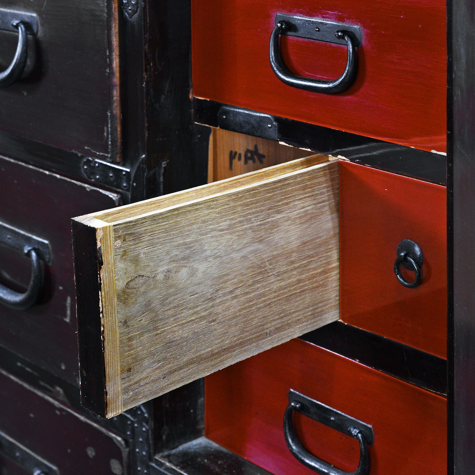 The large number of drawers makes this a highly practical chest of drawers. Isho tansu chests are specifically used for storing clothes. This tansu is constructed with a sugi (cedar) frame and kiri wood drawers.
