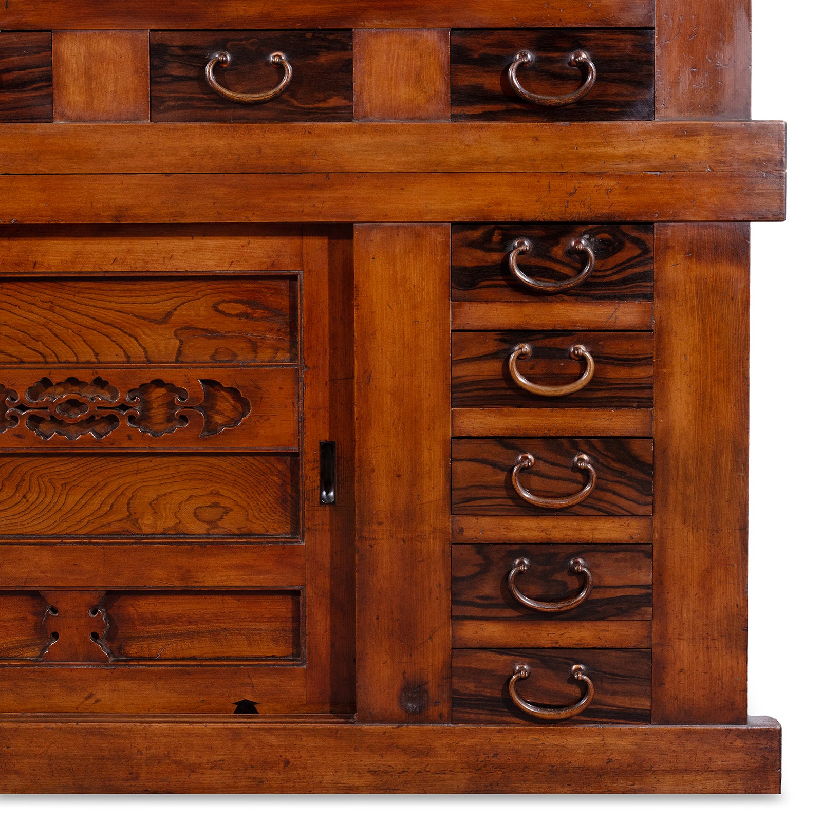 This magnificent Japanese mizuya dansu (kitchen chest) dates from the Meiji period (circa 1900) and is an unusual example with persimmon arrow inserts and drawer fronts (persimmon is rarely used on larger tansu). Mizuya dansu were central to Japanese households, used for the storage of food, crockery, and utensils, and this piece beautifully reflects that heritage with its 17 drawers, three compartments hidden behind sliding doors, and a variety of practical storage spaces.