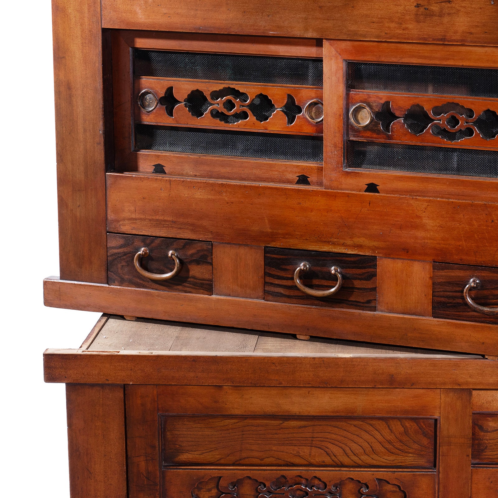 The chest was constructed by a master woodworker. Both persimmon and burr keyaki often warp and require a skilled craftsman to manipulate them. Persimmon and red elm are both premium woods suggesting a wealthy original owner. This Mizuya dansu is crafted from a combination of woods, the frame is made of durable hinoki (Japanese cypress), drawer fronts of richly toned persimmon, the carcass of sugi (Japanese cedar), and the sliding door panels of burr keyaki (zelkova / red elm). The cabinet is constructed in two stacking sections, making it easier to transport and assemble €” a feature often seen in Japanese tansu.
