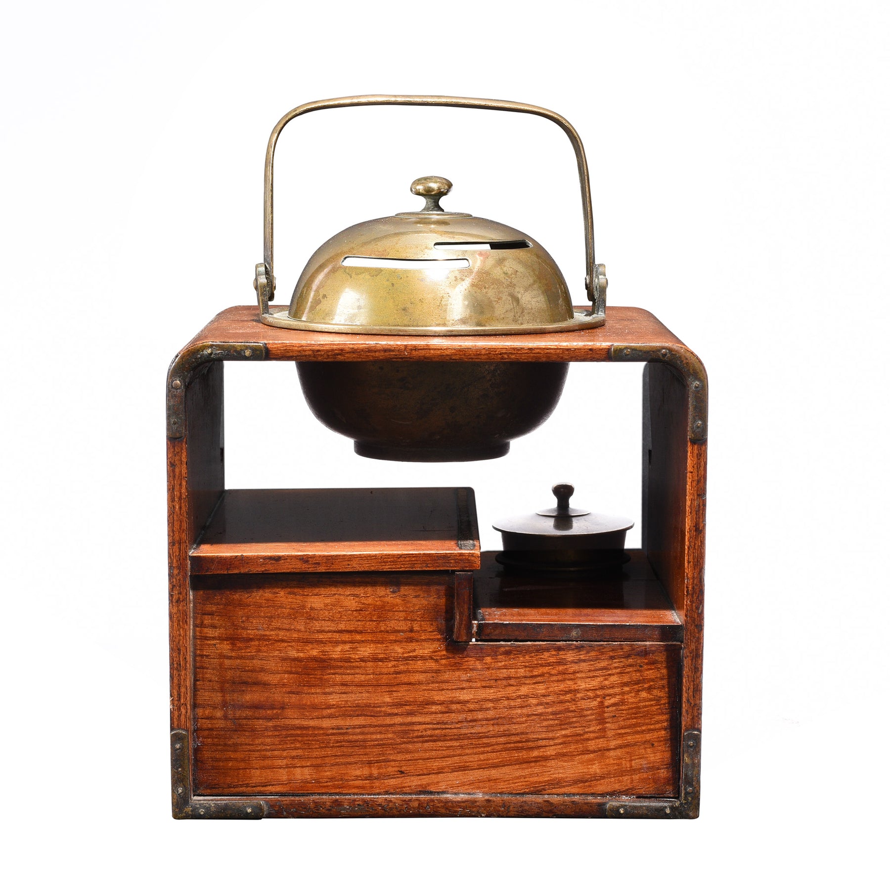 Known as a 'Tabako-bon' this tobacco stand with a miniature brazier 'hi-ire' atop dates from the Edo period (1603 - 1867). Made from zelkova (red elm) and brass, it is particularly lovely form.