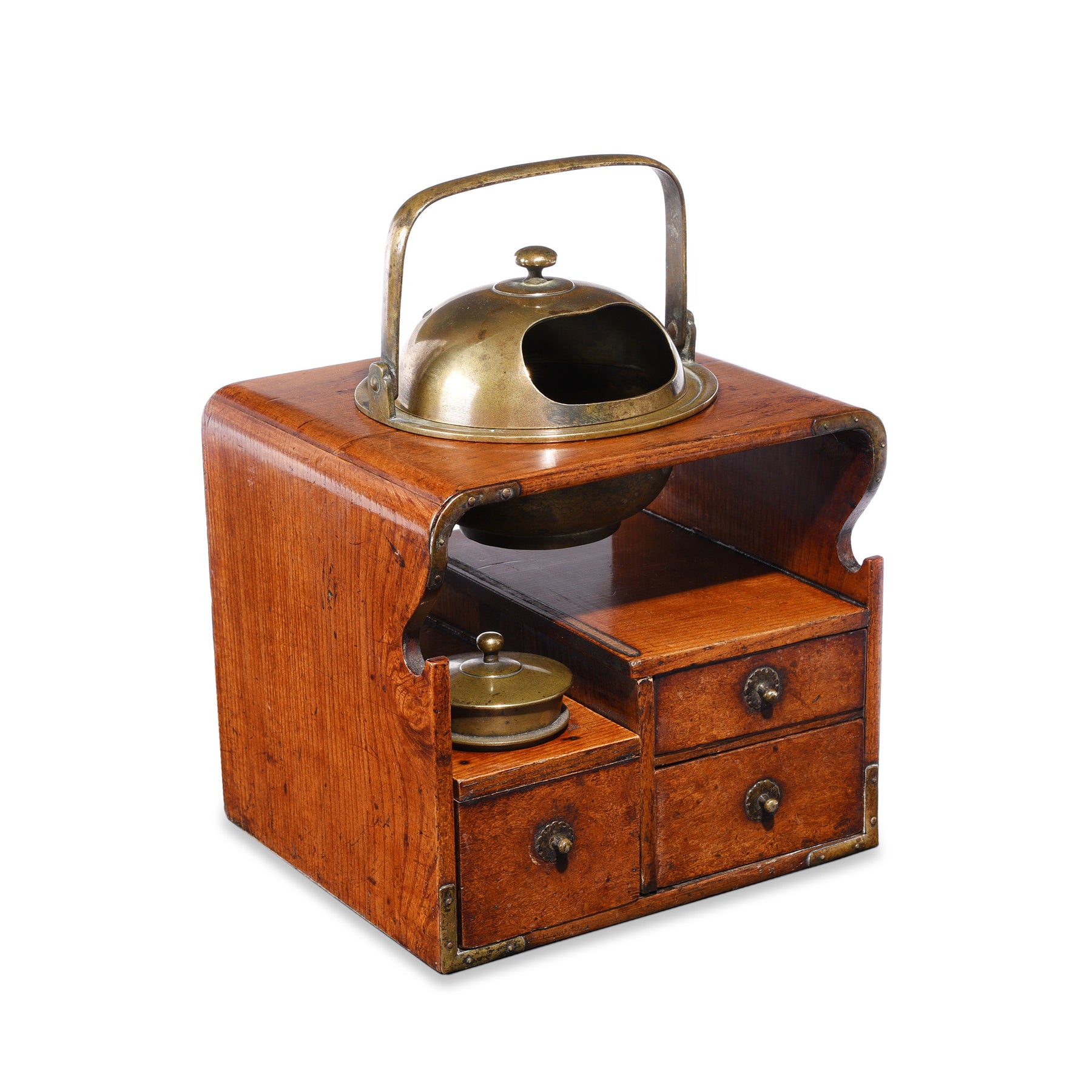 The three drawers and brass compartment would have been used for keeping tobacco and the carved groove would have held a pipe.