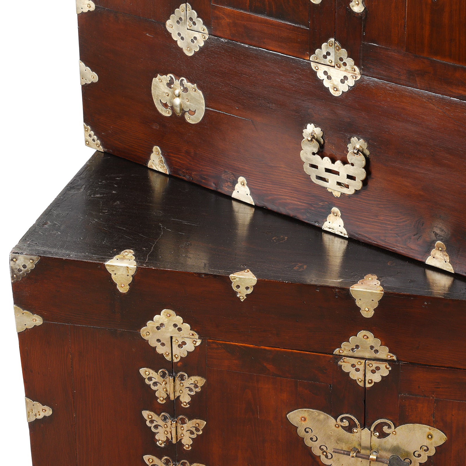 The construction is from red pine (so namu) and paulownia (odong namu) woods with traditional yellow brass fittings. The chest separates into three parts. As with almost all Korean pieces, it is finished internally with hanji, traditional handmade Korean paper made using the inner bark of the mulberry tree. Its compact stature makes it perfect for smaller rooms or a study.