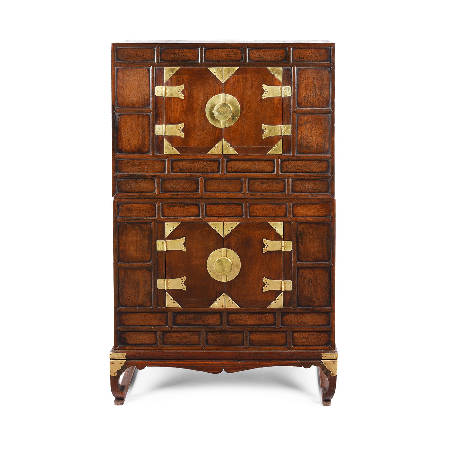 The doors are fastened with traditional locking pins concealed by a brass locking plate. The fittings are indicative of pieces from Gyeonggi Do province which surrounds Seoul. Gyeonggi-do literally translates as 'the area surrounding the capital'.