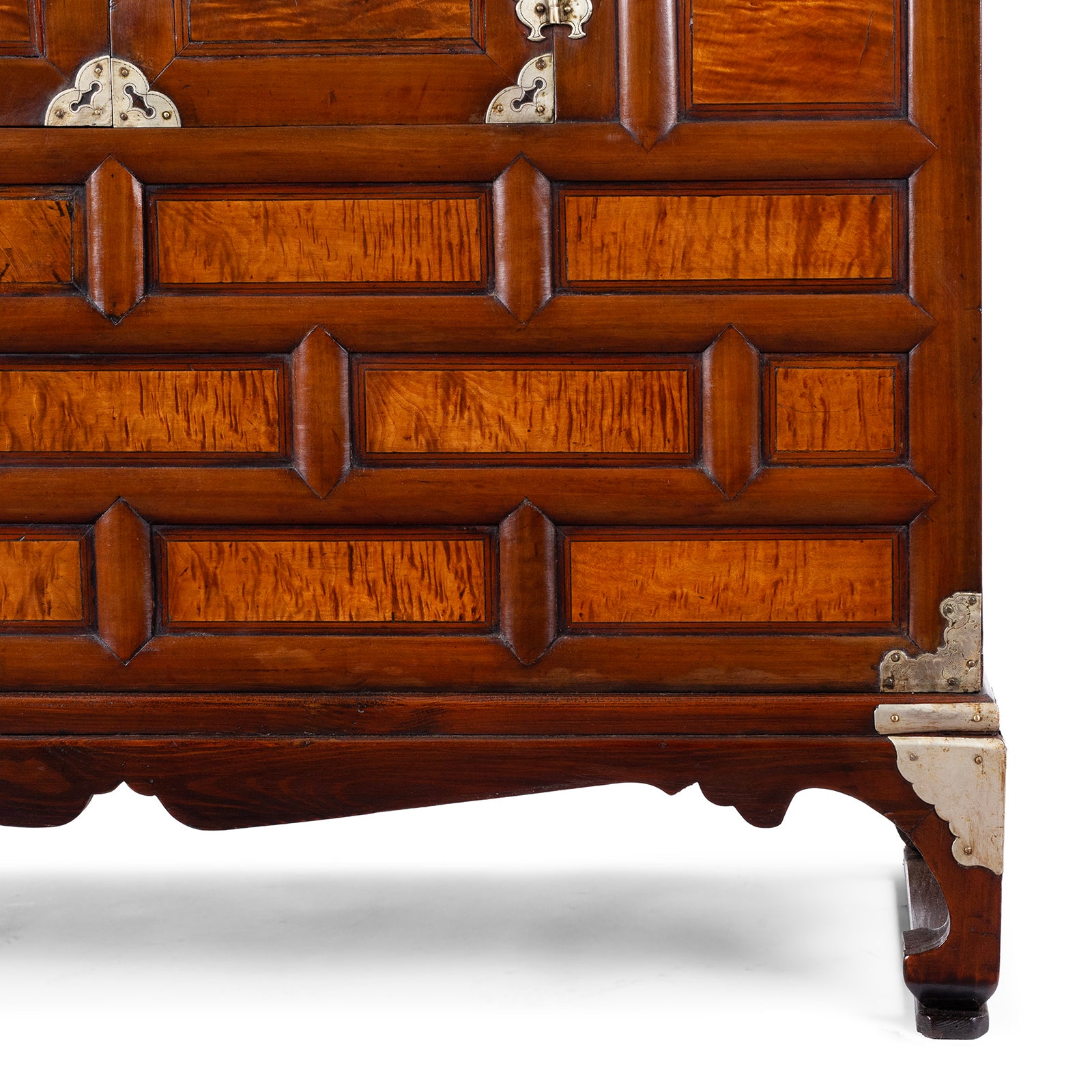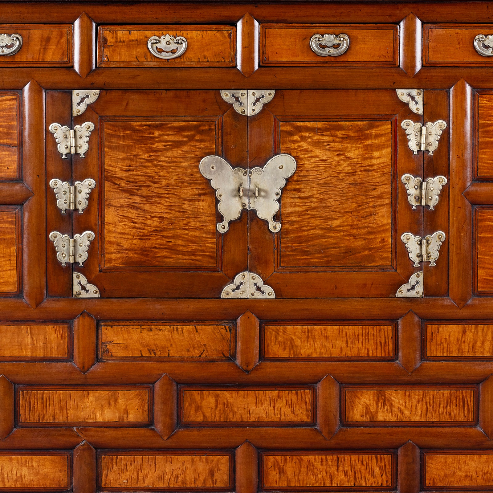 This early 20th-century example, dating to around 1920, has likely been adapted from an ich'ung jang (two-part chest) and reduced in height, giving it a more compact form suited to modern interiors. Crafted from richly burr maple wood panels with a pine frame, with the typical lightweight construction traditional of Korean cabinetry. The original white brass butterfly hinges and corner mounts, are a traditional motif symbolising happiness and longevity.