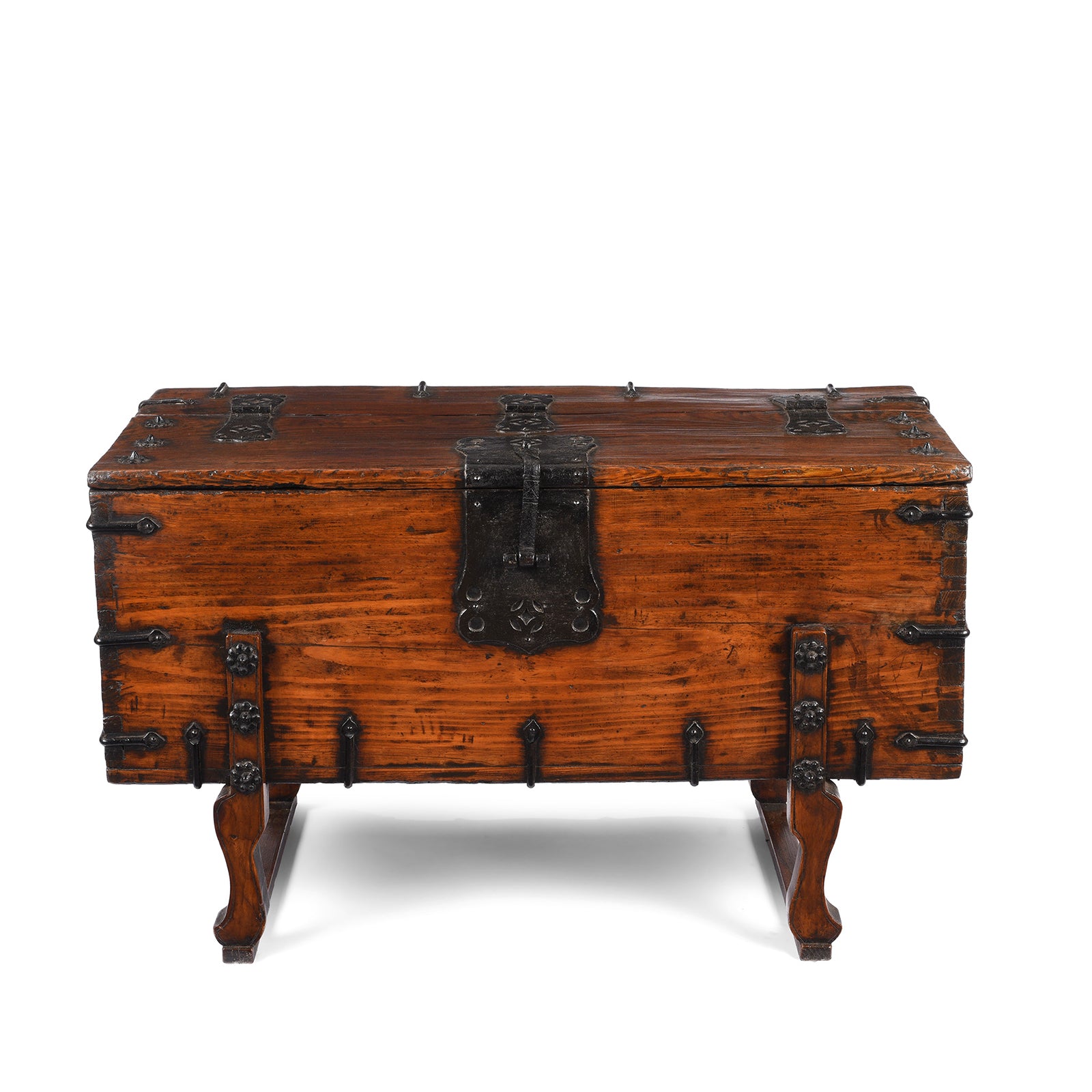 This old Korean coin chest on stand is known locally as a Ton-Kwe 돈궤. It's immediately identifiable from its pine wood frame and iconic iron hardware. Traditional coin chests were around 1 - 1.2 meters in length and were made from red elm, from the 20th century, the majority of ton-kwe were constructed from pine, reinforced with iron.