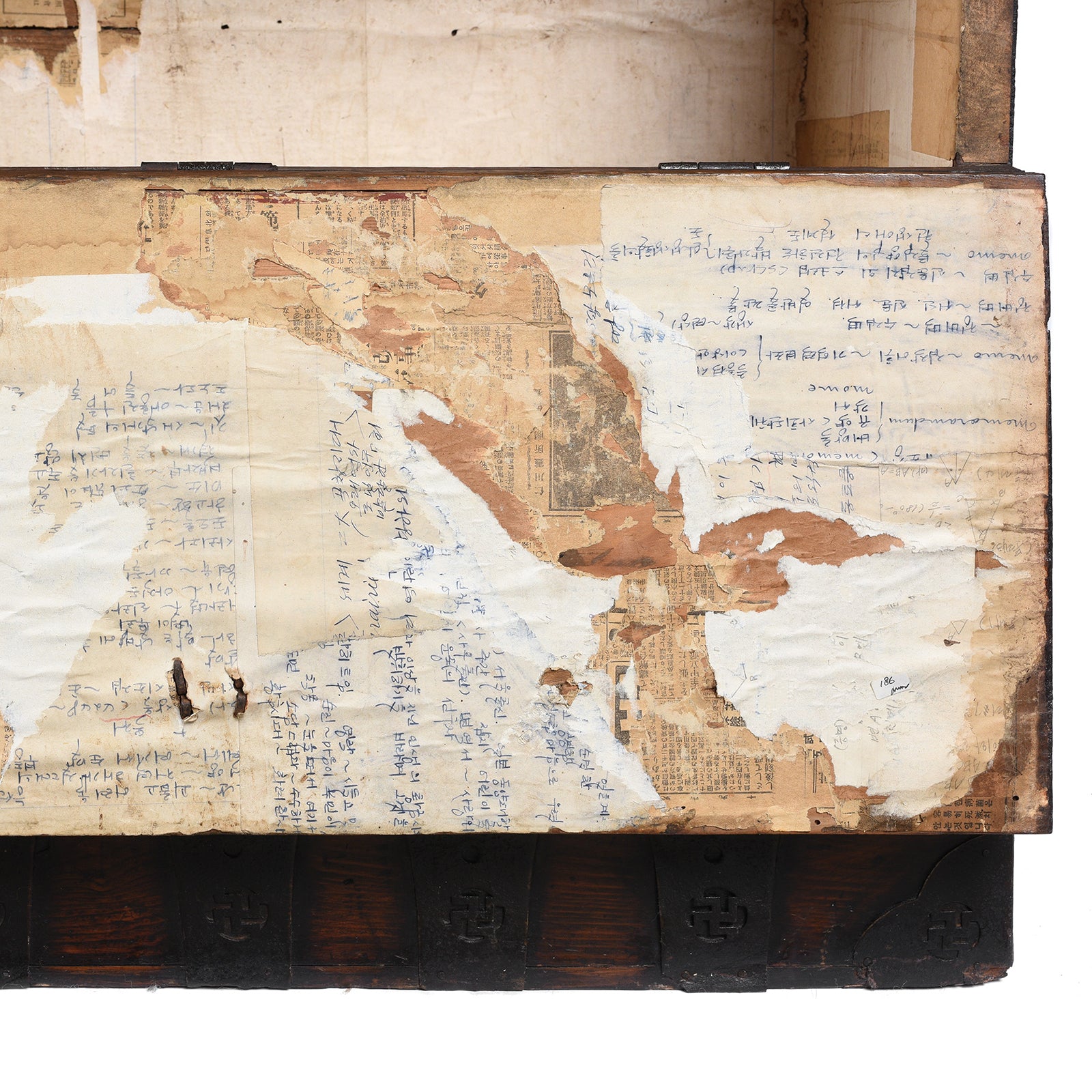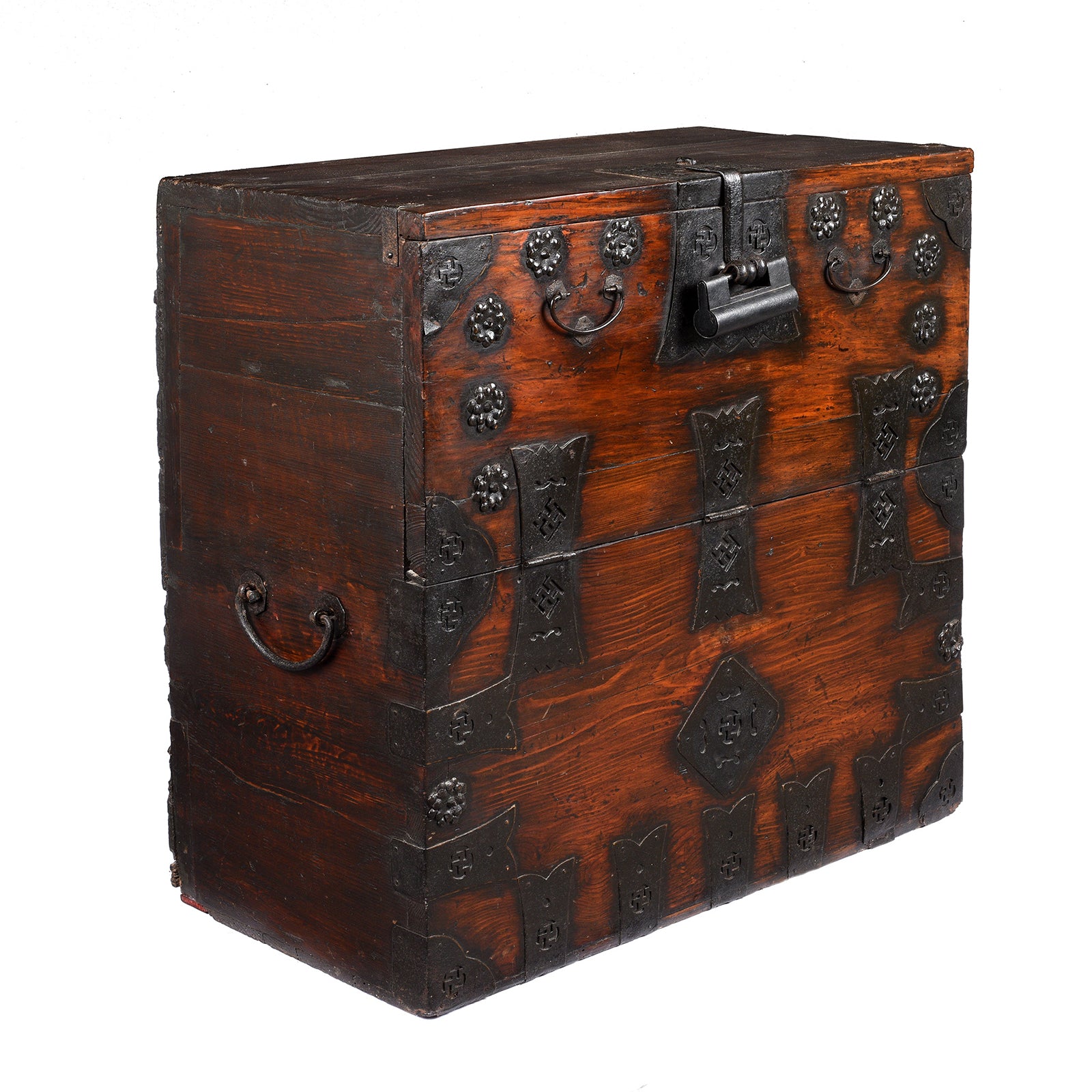 Korean bandaji chests were used as blanket and clothing chests. Clothes were usually stored inside and folded blankets on top. Like this example, almost all bandaji are front opening with a hinged top section folding down. Bandaji literally means 'half closing' in Korean. Korean furniture interiors are often finished internally with hanji, traditional handmade Korean paper made using the inner bark of the mulberry tree. This piece is finished with hanji. The iron is formed with cloud motifs, symbols of longevity which bring desire for success.