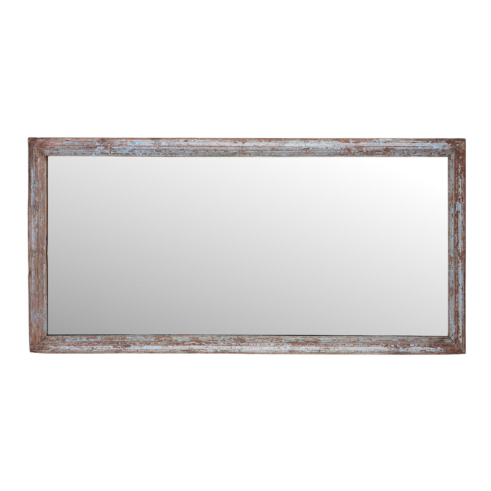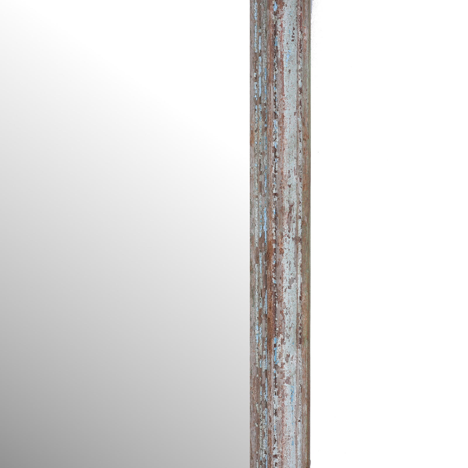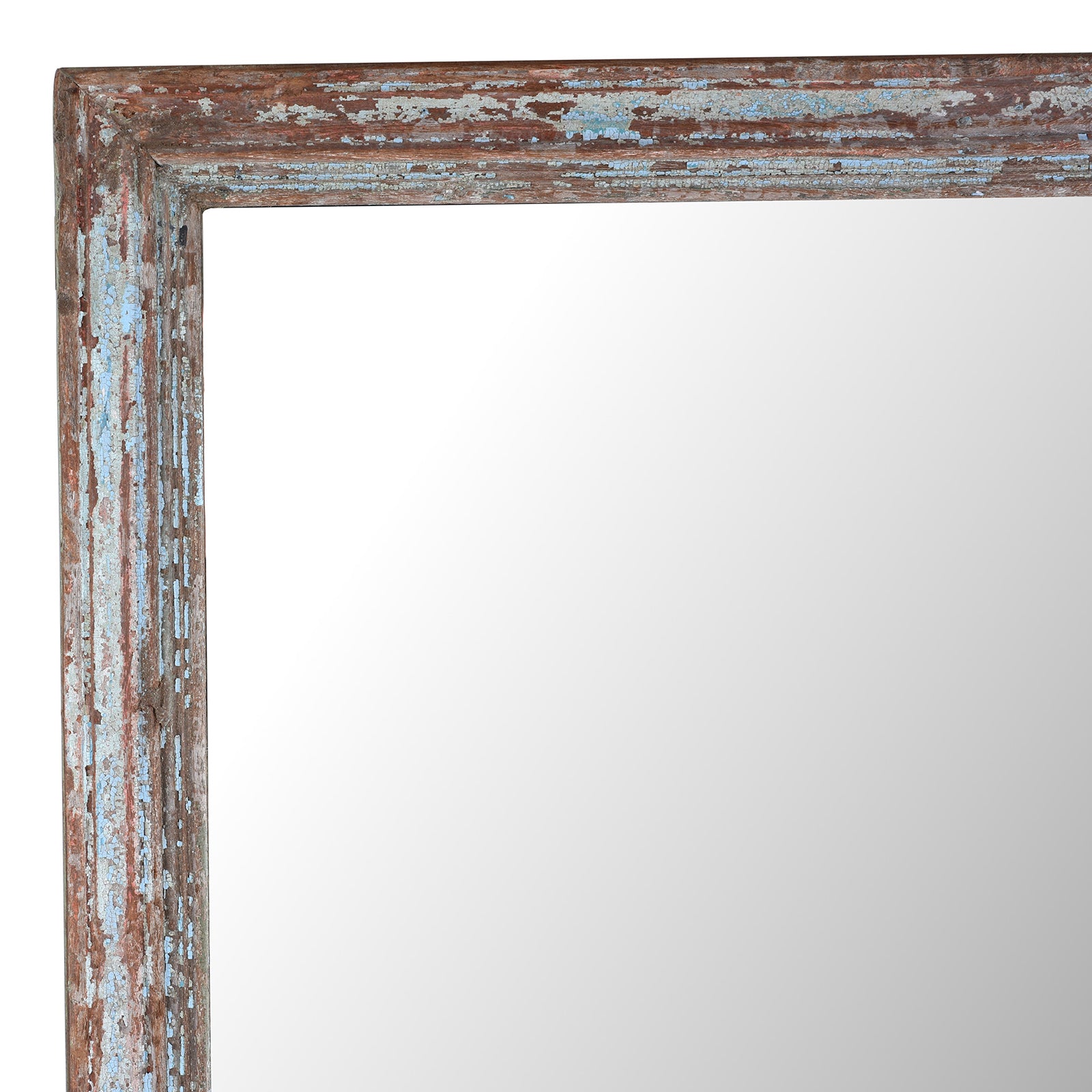 This Indian mirror crafted from reclaimed teak features a beautifully faded blue painted finish, giving it a relaxed and timeworn character. The timber has been salvaged from older architectural elements, with layers of paint naturally worn through years of use, revealing warm tones of the wood beneath and creating a richly textured patina.