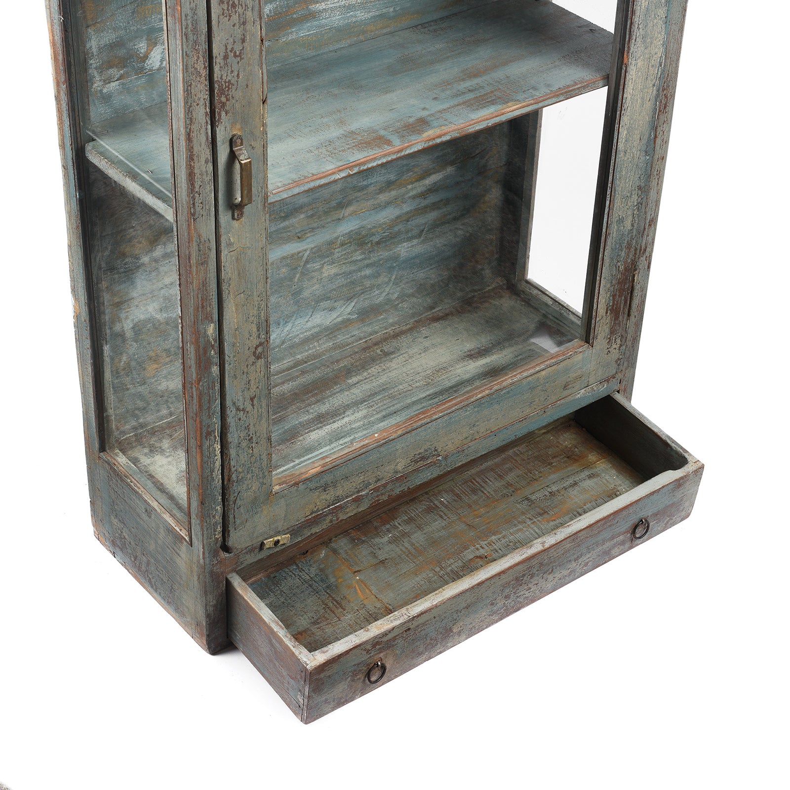 An elegant solution for storing your collectibles, this large teak wall cabinet is almost 100 years old. It has a single simple shelf and a glass panel. These cabinets are great for a kitchen as a spice cabinet or a bathroom toiletries cabinet. It also has a handy drawer at the bottom adding additional storage.