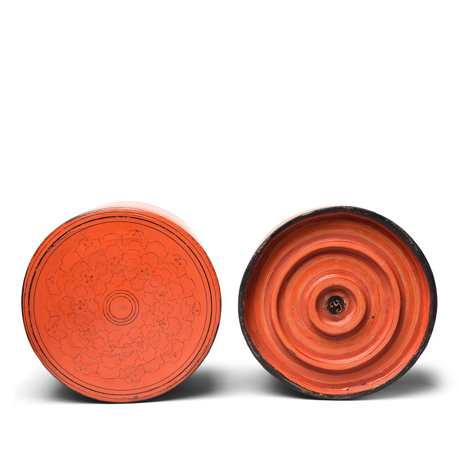 This is an excellent example of a Burmese lacquer box and larger than is usually found. These boxes were multifunctional and used both as tiffin boxes and betel boxes (kun it). This Burmese lacquer box is typical of the style and has a base orange-red colour and is decorated with finely etched black motifs including a kunan kanbyat pattern.  The underside is etched with a single character, likely the name of the owner.