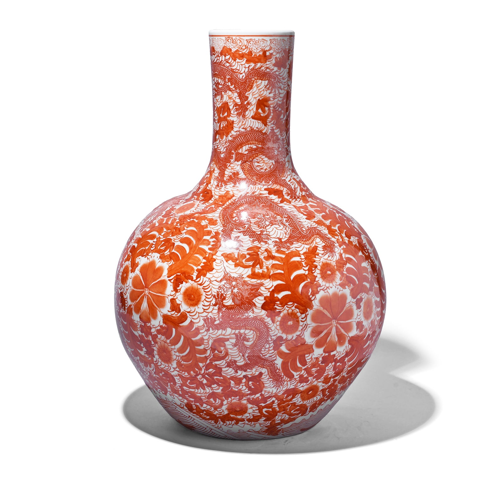 This dramatic and large tianqiuping iron red porcelain dragon vase is a reproduction of similar vases sold at auctions. Our reproduction Chinese vases are turned and hand painted by skilled artists using traditional techniques learned from their families and passed down through generations.